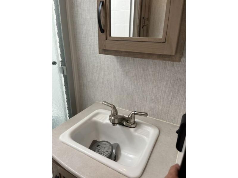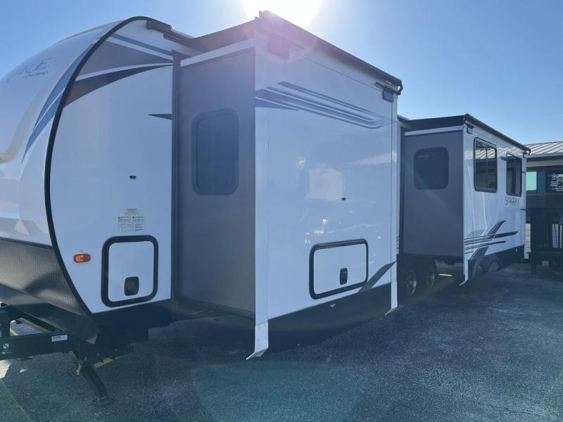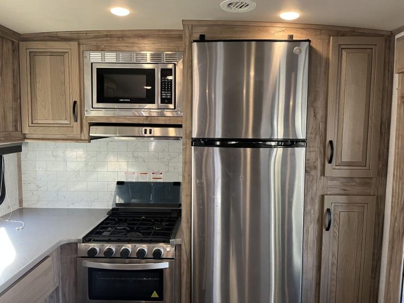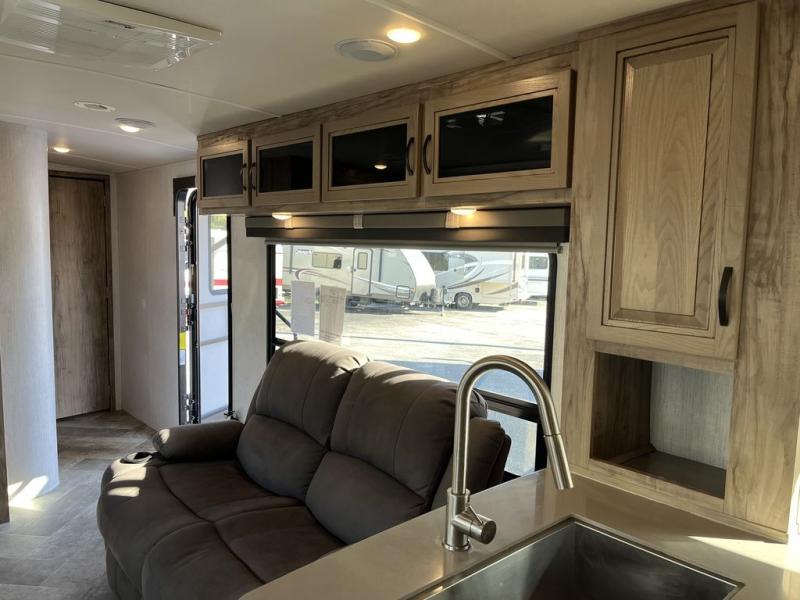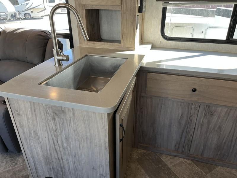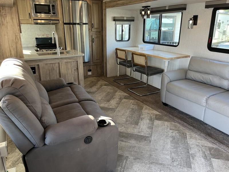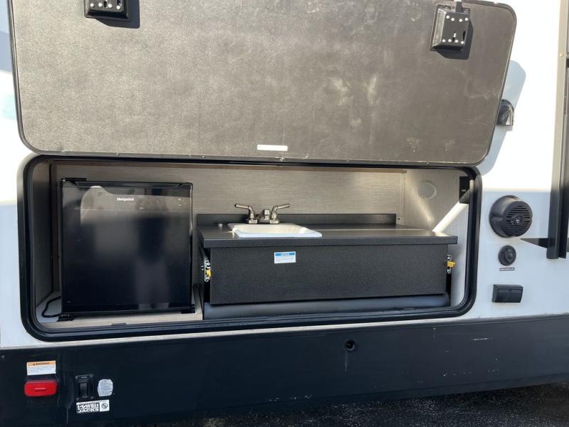 Get ready for lots of relaxation, and spacious living in this trailer when you camp! The rear kitchen offers a pantry, an 11 cu. ft. refrigerator, a microwave, a glass top flush mount range, and a U-shaped counter giving the cook lots of space for meal prep. And there is an outside kitchen for more ways to feed everyone, plus a 20' power awning which provides protection from the elements and creates an outdoor living area. The main area is spacious with a slide out that includes a booth dinette and sofa sleeper or choose the theater seating option, and there are two chairs to relax in as well. The full bathroom offers a shower with a seat, and the front bedroom offers privacy, a slide out king bed, a dresser, a front closet and a wardrobe that includes a washer/dryer prepped area if you decide to add those optional appliances.