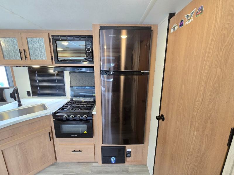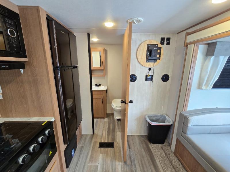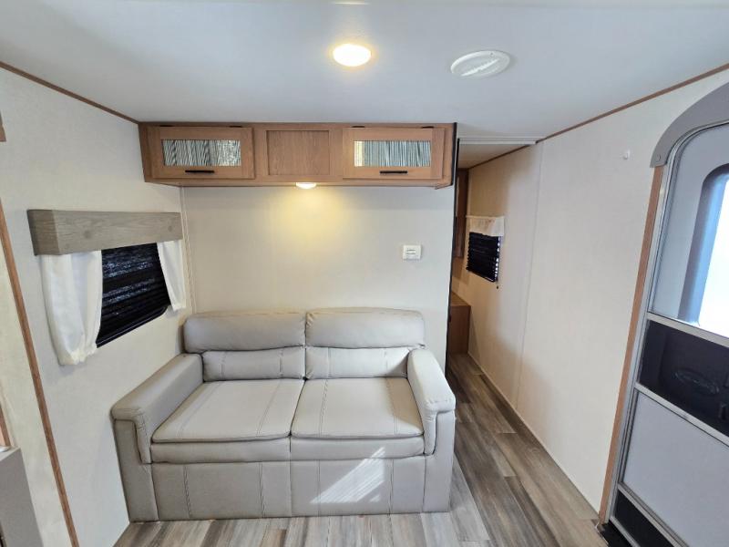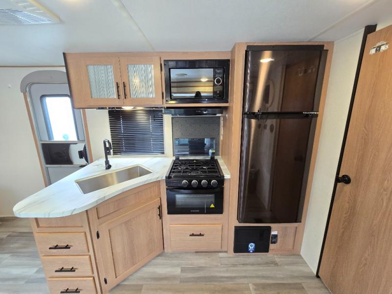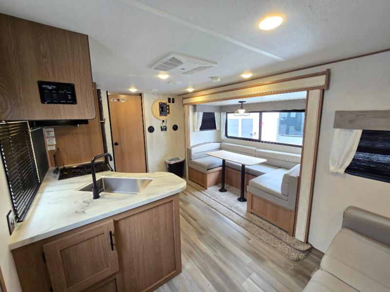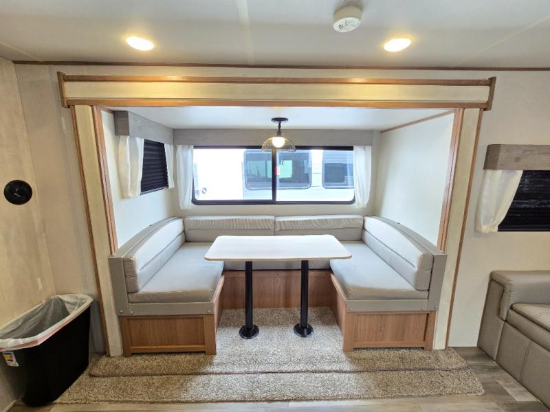 This rear bath travel trailer offers privacy to change and get cleaned up as well as includes linen storage so you will have everything you need in one place. The walk-around queen bed in the private bedroom as well as the furniture folds down into extra sleeping space at night allowing five to six to sleep comfortably after hiking, relaxing and enjoying the outdoors. The cook will appreciate the three-burner range to make snacks and meals to eat at the U-shaped dinette slide or outside under the power awning that creates a covered outdoor living area protected from the elements.