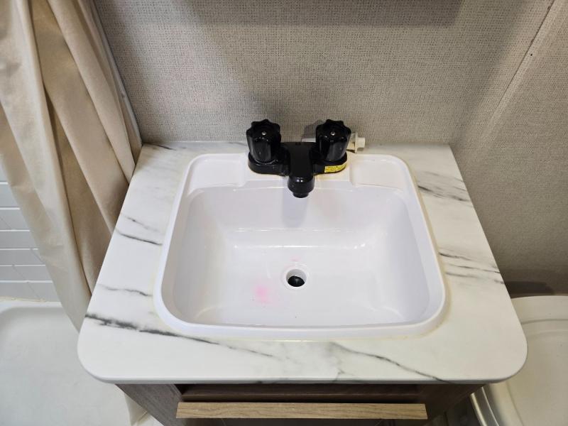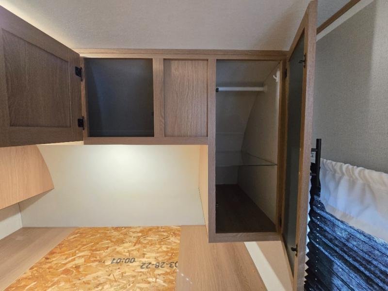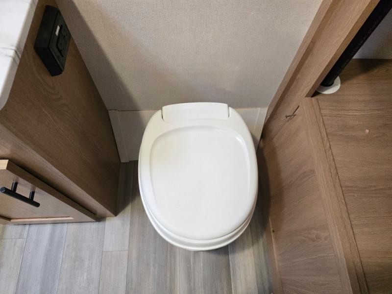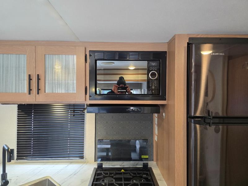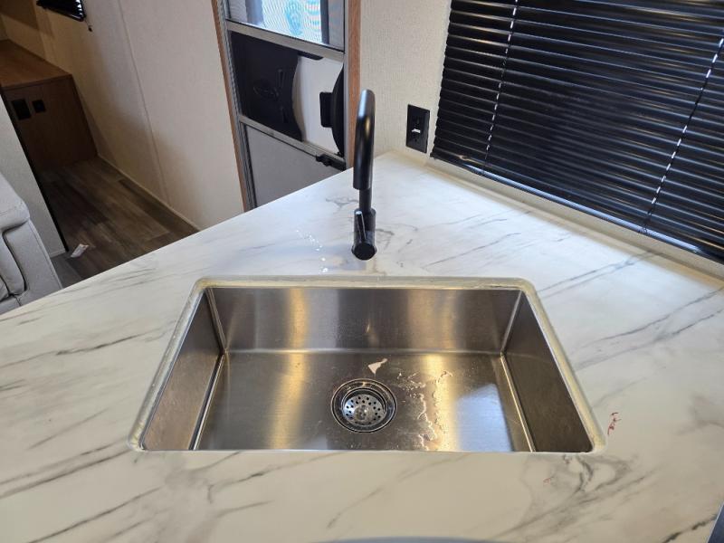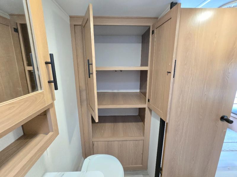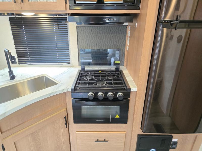 This rear bath travel trailer offers privacy to change and get cleaned up as well as includes linen storage so you will have everything you need in one place. The walk-around queen bed in the private bedroom as well as the furniture folds down into extra sleeping space at night allowing five to six to sleep comfortably after hiking, relaxing and enjoying the outdoors. The cook will appreciate the three-burner range to make snacks and meals to eat at the U-shaped dinette slide or outside under the power awning that creates a covered outdoor living area protected from the elements.