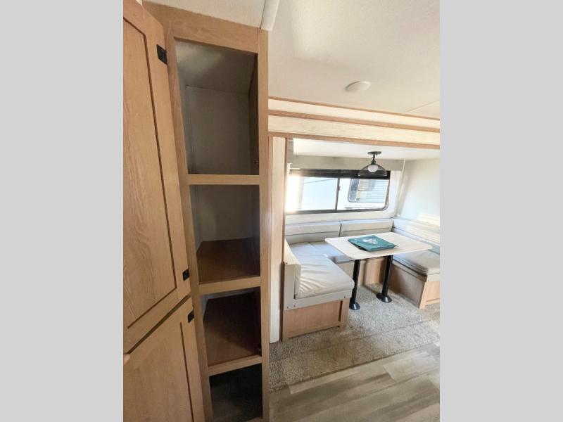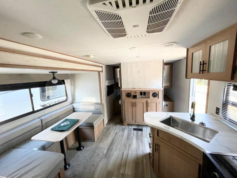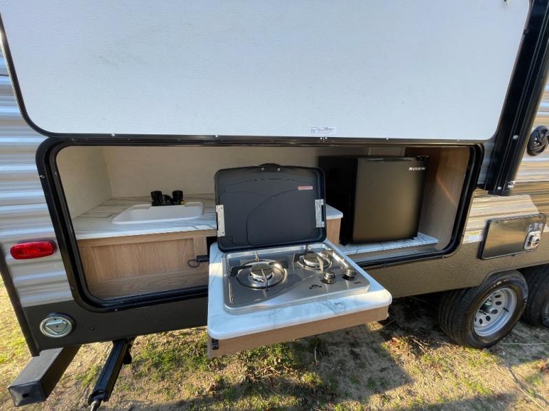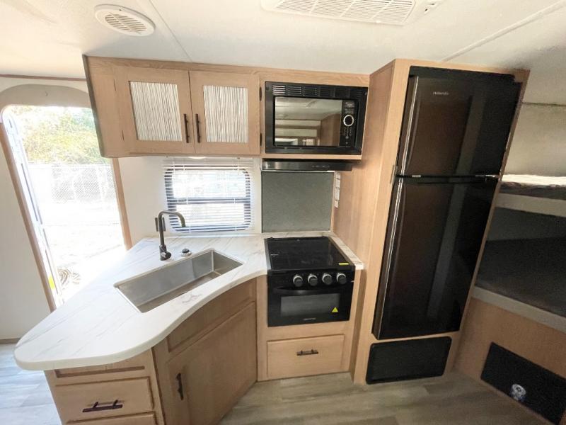Gather the crew, load up and head out to enjoy a long-weekend at the state park or your main RV park that you like to meet up with friends. This trailer offers sleeping accommodations for eight because of the double-size bunks, the U-shaped dinette, and the queen bed. There is a rear corner full bathroom with a shower curtain on a curved track providing more elbow room. You will find full kitchen amenities inside, as well as an outdoor kitchen where you can watch the kids play while making dinner. The single slide provides more living space in the interior, as well as extra sleeping space on the U-shaped dinette.