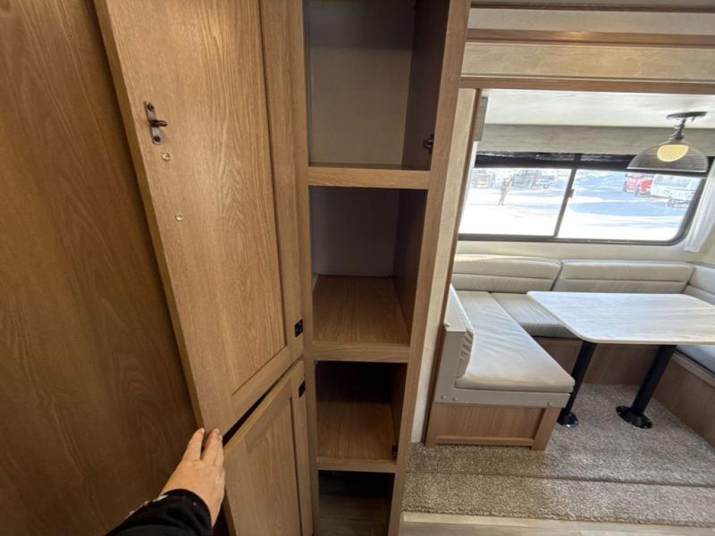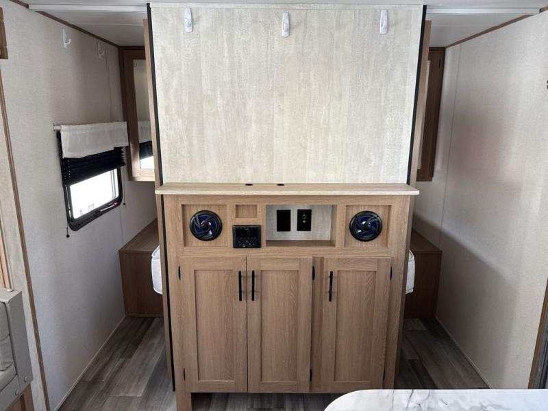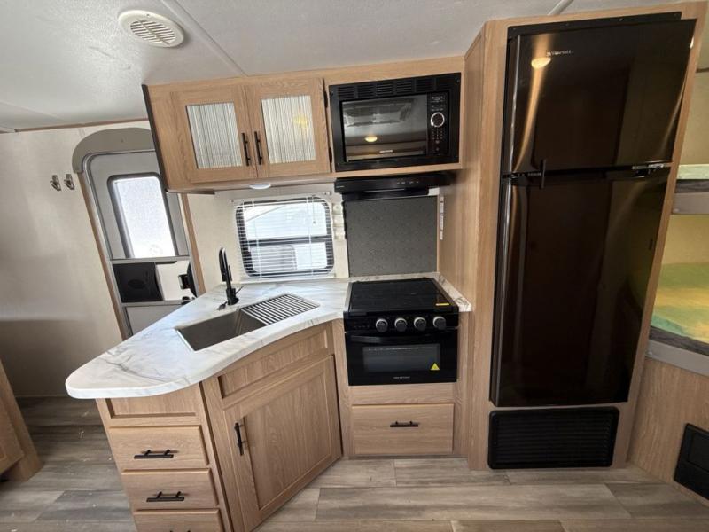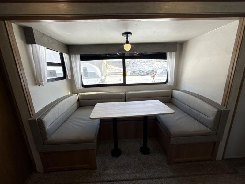 Gather the crew, load up and head out to enjoy a long-weekend at the state park or your main RV park that you like to meet up with friends. This trailer offers sleeping accommodations for eight because of the double-size bunks, the U-shaped dinette, and the queen bed. There is a rear corner full bathroom with a shower curtain on a curved track providing more elbow room. You will find full kitchen amenities inside, as well as an outdoor kitchen where you can watch the kids play while making dinner. The single slide provides more living space in the interior, as well as extra sleeping space on the U-shaped dinette.