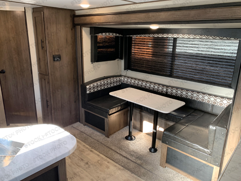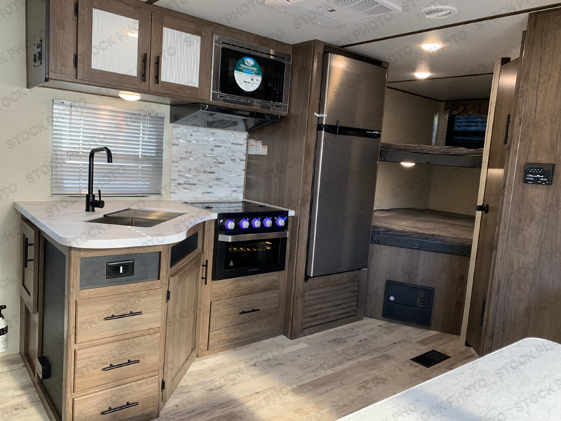 Gather the crew, load up and head out to enjoy a long-weekend at the state park or your main RV park that you like to meet up with friends. This trailer offers sleeping accommodations for eight because of the double-size bunks, the U-shaped dinette, and the queen bed. There is a rear corner full bathroom with a shower curtain on a curved track providing more elbow room. You will find full kitchen amenities inside, as well as an outdoor kitchen where you can watch the kids play while making dinner. The single slide provides more living space in the interior, as well as extra sleeping space on the U-shaped dinette.