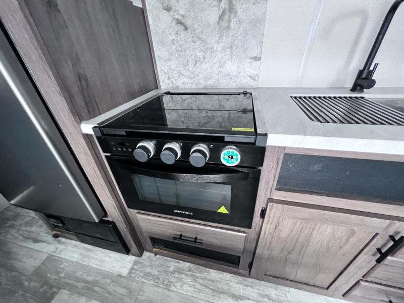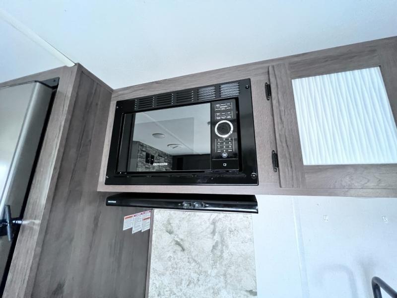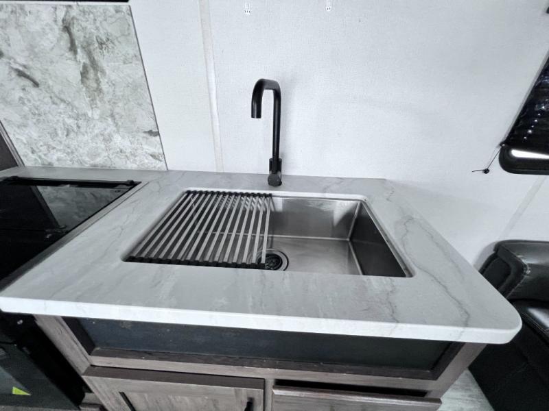 The cook is going to enjoy having choices for every meal, whether to use the full kitchen amenities inside or the outdoor kitchen while visiting with others relaxing under the 13' power awning. With the inclusion of a walk-around queen bed in the front bedroom, plus the sofa and booth dinette in the combined kitchen and living area, and the double-size bunks next to the bathroom sink and private toilet and toilet room, there is plenty of room to sleep eight or nine people each night. And the power awnings plus outdoor speakers give you an additional living area for everyone.