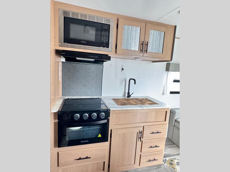 The cook is going to enjoy having choices for every meal, whether to use the full kitchen amenities inside or the outdoor kitchen while visiting with others relaxing under the 13' power awning. With the inclusion of a walk-around queen bed in the front bedroom, plus the sofa and booth dinette in the combined kitchen and living area, and the double-size bunks next to the bathroom sink and private toilet and toilet room, there is plenty of room to sleep eight or nine people each night. And the power awnings plus outdoor speakers give you an additional living area for everyone.