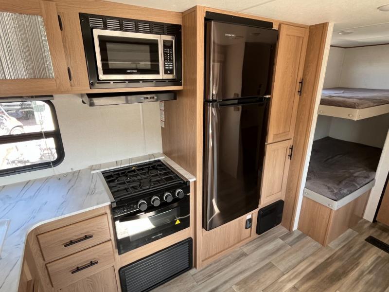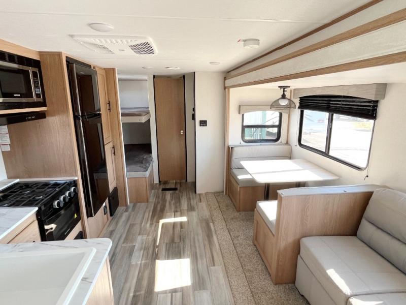 Looking for a trailer that houses everyone, this trailer offers lots of sleeping choices with a set of double-size bunks, a queen bed and furniture that doubles as sleeping space! You will also appreciate the added interior space thanks to the large slide in the living area that features a booth dinette and sofa. Up front, there is a private bedroom where you can retreat to at night away from the bunks in the back, and the bedroom features ample storage with dual wardrobes and an overhead shelf for your things.