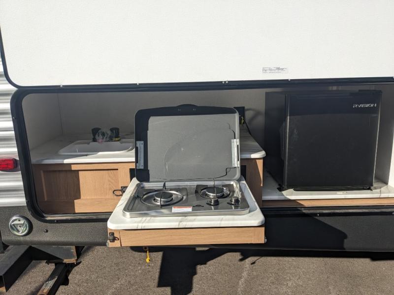 You and your family will love this trailer with all the sleeping accommodations, the privacy and the outdoor features! From the double-size bunks next to the full bathroom, the private front bedroom with space savings sliding doors, a walk-around queen bed, dual wardrobes, overhead cabinets for more storage to the furniture in the large slide in the main living and kitchen area. The slide offers more floor space while cooking with full amenities including a pantry, plus the sofa and U-shaped dinette offer plenty of seating. And the outside kitchen provides the cook another choice when feeding everyone, plus the 16' power awning gives you protection from the elements.