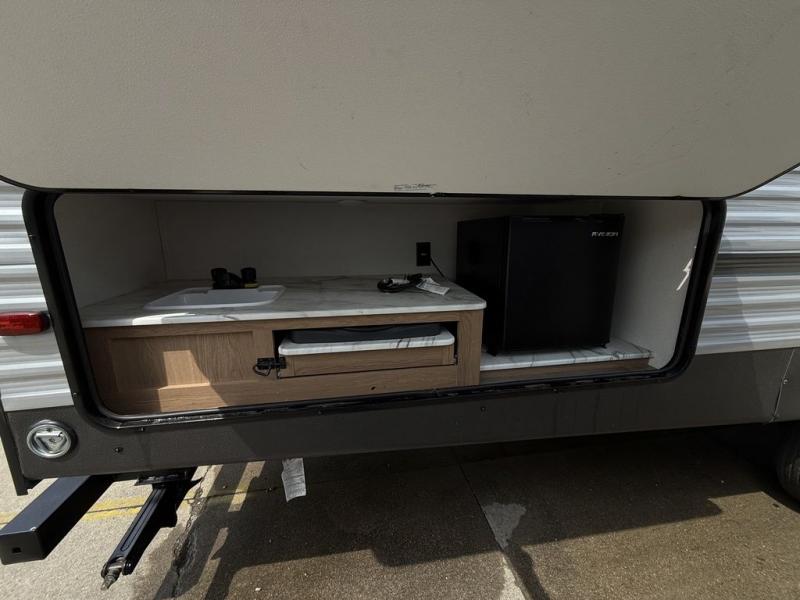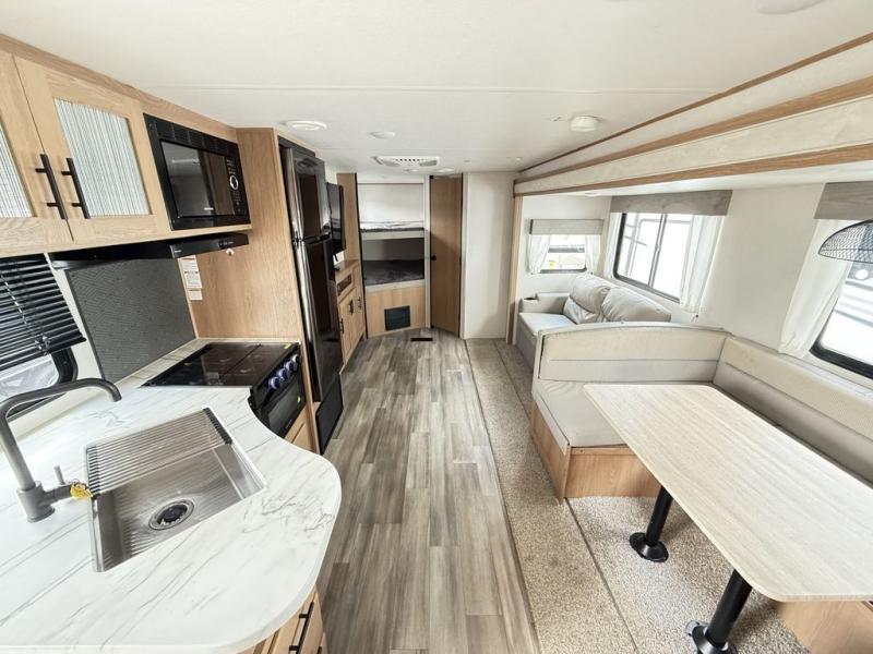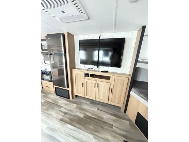 You and your family will love this trailer with all the sleeping accommodations, the privacy and the outdoor features! From the double-size bunks next to the full bathroom, the private front bedroom with space savings sliding doors, a walk-around queen bed, dual wardrobes, overhead cabinets for more storage to the furniture in the large slide in the main living and kitchen area. The slide offers more floor space while cooking with full amenities including a pantry, plus the sofa and U-shaped dinette offer plenty of seating. And the outside kitchen provides the cook another choice when feeding everyone, plus the 16' power awning gives you protection from the elements.
