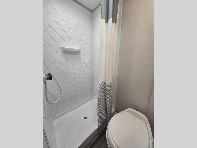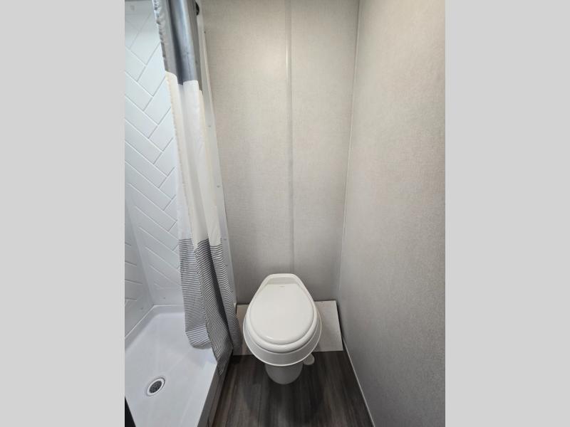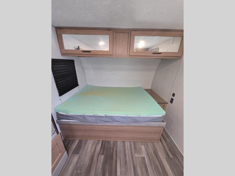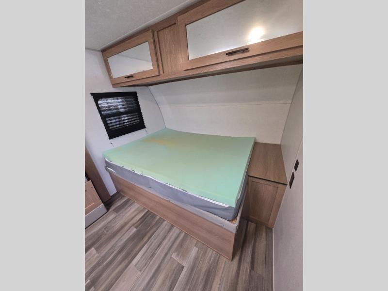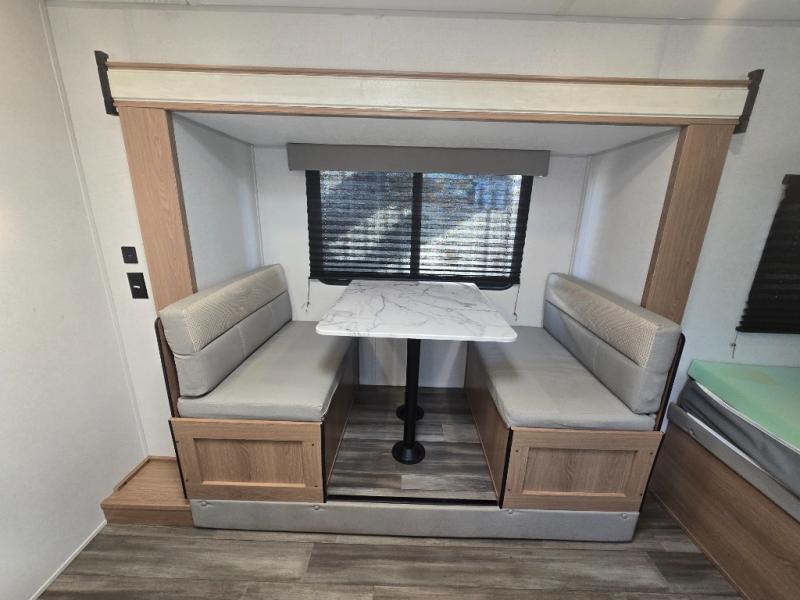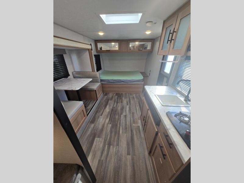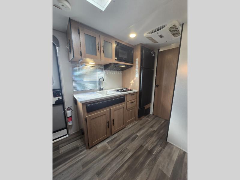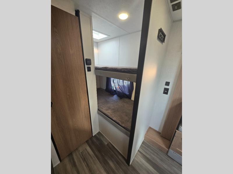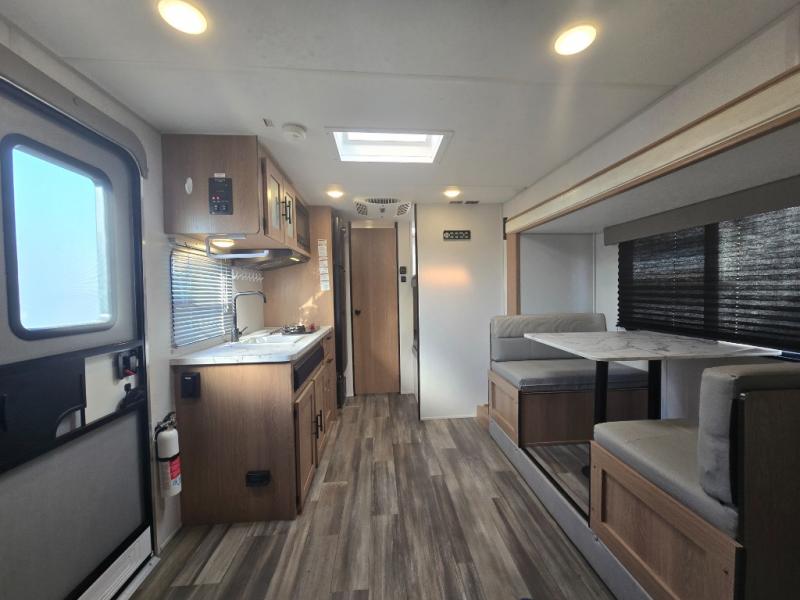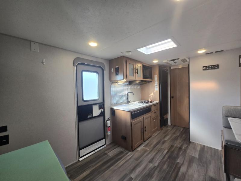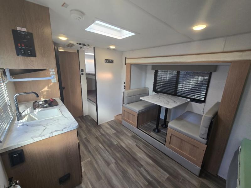 Go hiking, biking or exploring for new places when you have this trailer at the campgrounds! You will find sleeping for five between the rear corner bunk beds, and the front bed with a nightstand for your cellphones and such. And one more can sleep on the dinette slide. You'll be delighted with the kitchen skylight that gives natural lighting as you cook a meal. The LED-lit power awning and outdoor speakers provide a protected outdoor living area as you visit or make s'mores around the campfire.