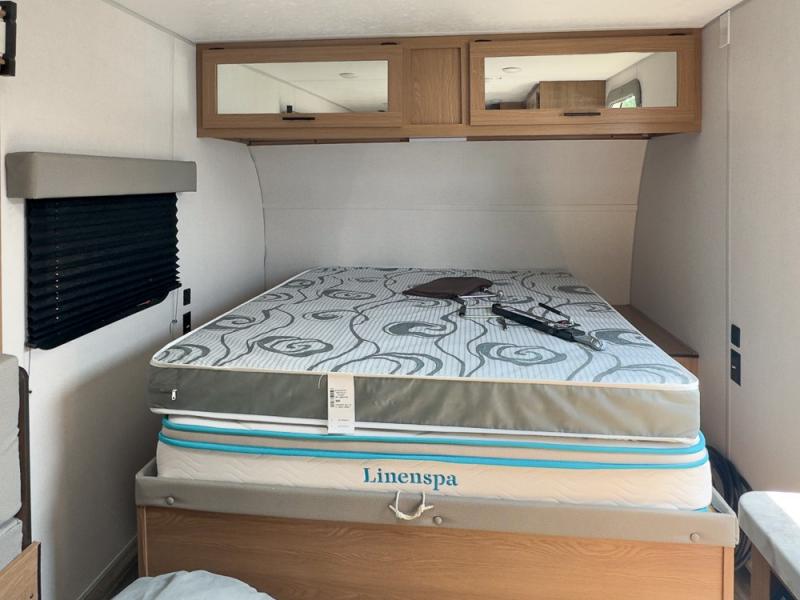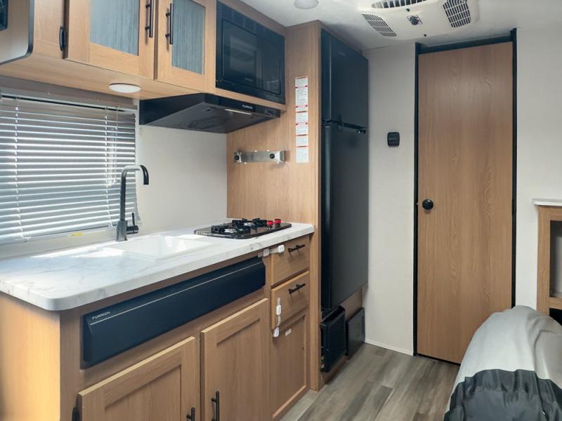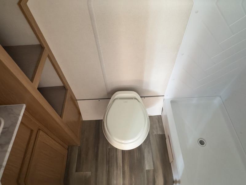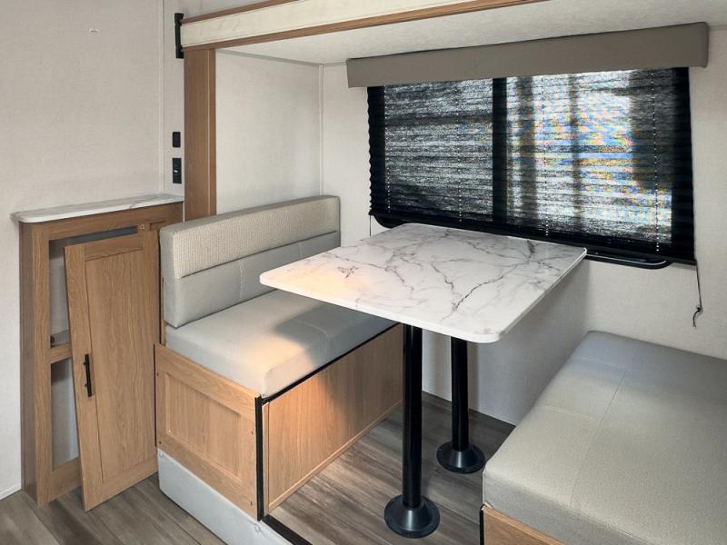 Enjoy a little more floor space in this trailer thanks to the dinette slide that can be utilized as a dining, gaming and/or sleeping space. The front walk-around queen bed offers overhead storage and dual wardrobes to keep this area tidy. The galley kitchen includes everything you need to make warm meals, and store leftovers in the 6 cu. ft. gas/electric refrigerator. And there is a pantry for dry good storage. The rear bathroom offers privacy and convenience when changing and getting cleaned up plus there is linen storage which is handy.