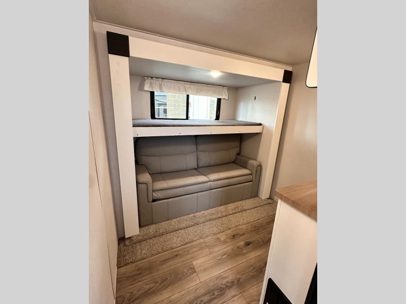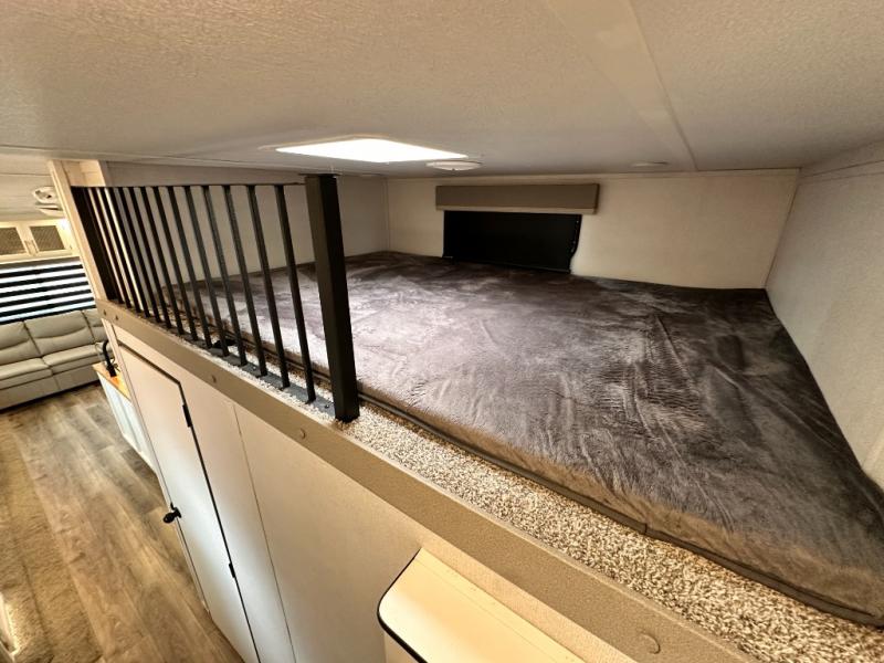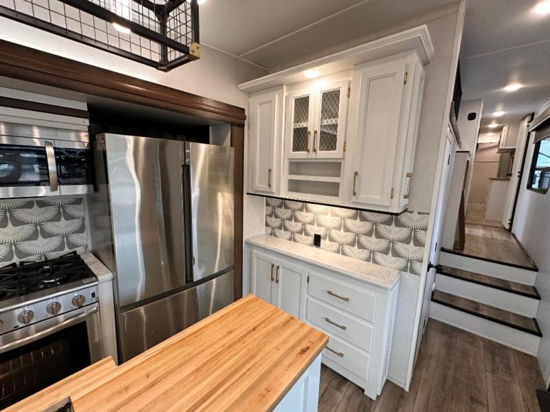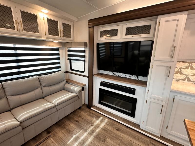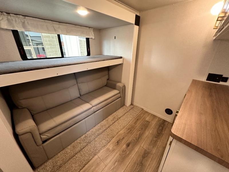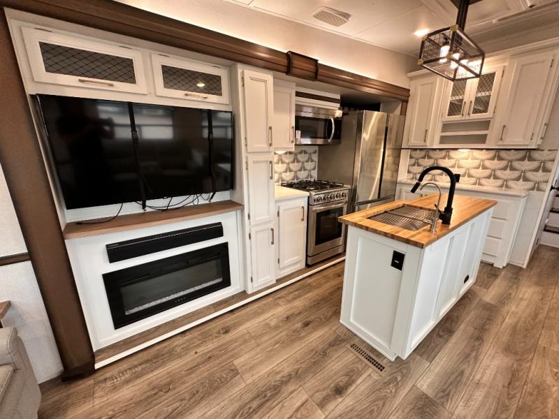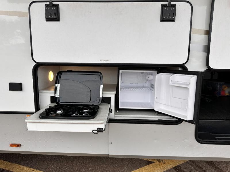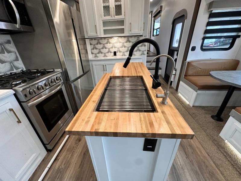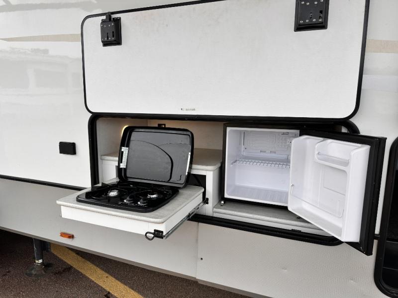 This fifth wheel is one your whole crew will love thanks to the middle bunkroom with a "Sleep & Play" sofa and an upper bunk! You will enjoy the front private bedroom all to yourselves with a king bed slide out, a large closet with washer and dryer prep, plus a dresser for more storage. When you're not outdoors relaxing under the 19' electric awning with LED lights, head to the rear living area to sit back on the theater seating or the hide-a-bed sofa. You'll also find an LED TV here and a booth dinette for game night. The chef will love the outside kitchen just as much as the indoor kitchen with a butcher block top, two pantries, plus a 30" residential style microwave!