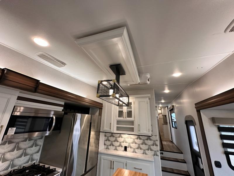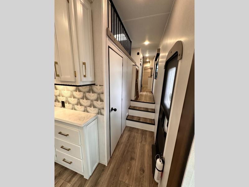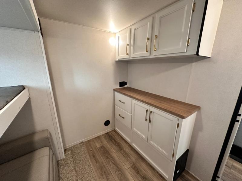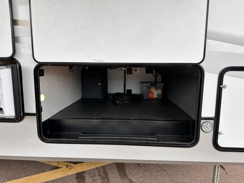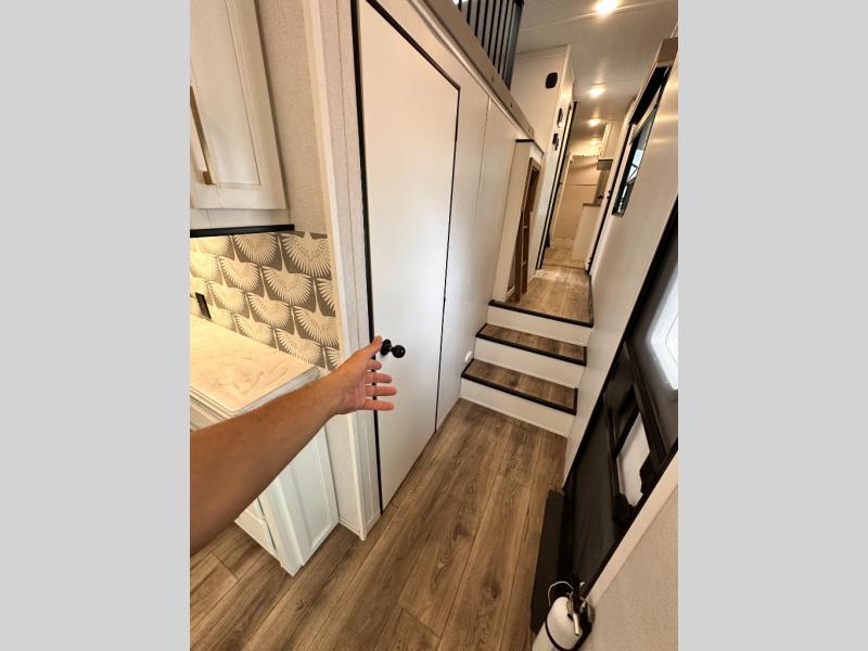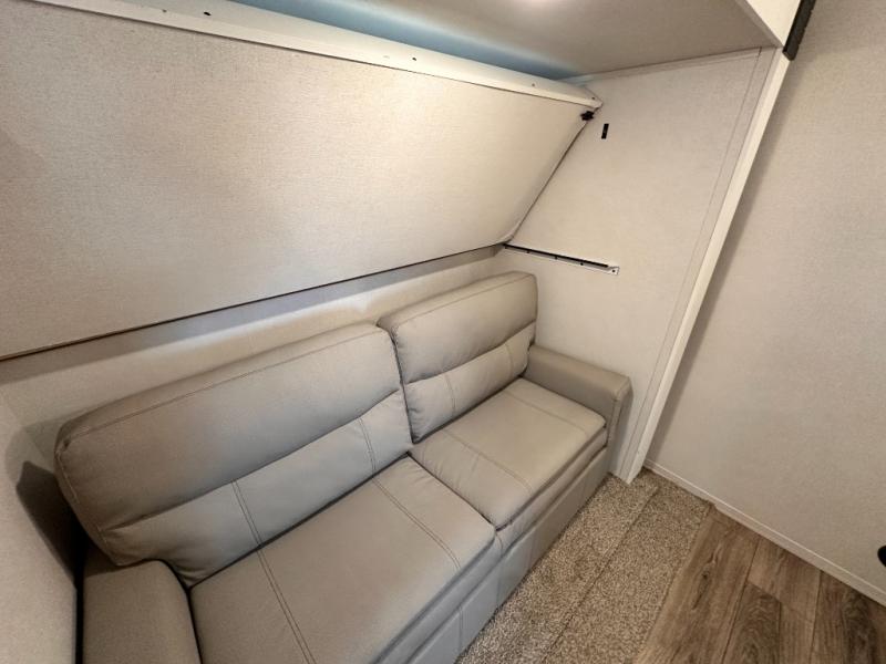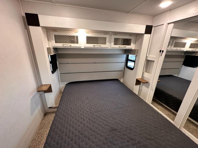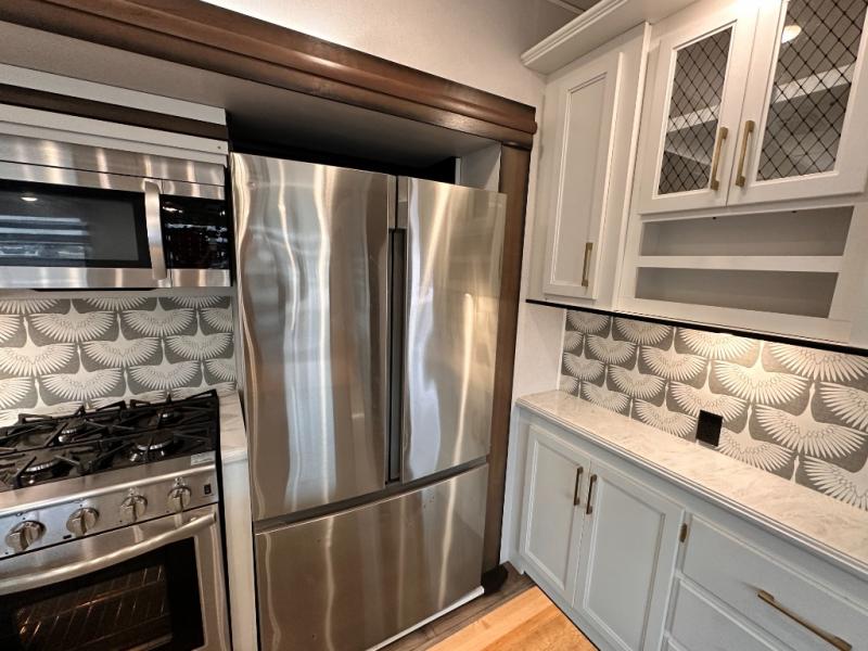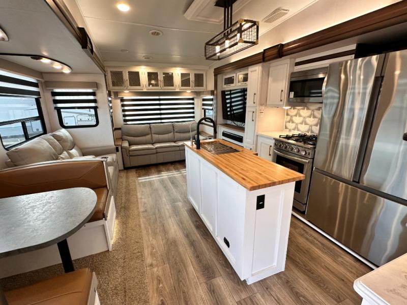 This fifth wheel is one your whole crew will love thanks to the middle bunkroom with a "Sleep & Play" sofa and an upper bunk! You will enjoy the front private bedroom all to yourselves with a king bed slide out, a large closet with washer and dryer prep, plus a dresser for more storage. When you're not outdoors relaxing under the 19' electric awning with LED lights, head to the rear living area to sit back on the theater seating or the hide-a-bed sofa. You'll also find an LED TV here and a booth dinette for game night. The chef will love the outside kitchen just as much as the indoor kitchen with a butcher block top, two pantries, plus a 30" residential style microwave!