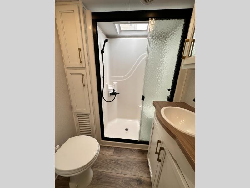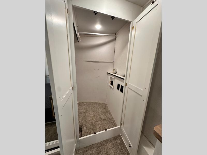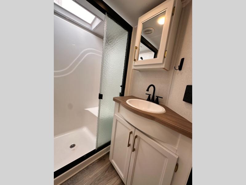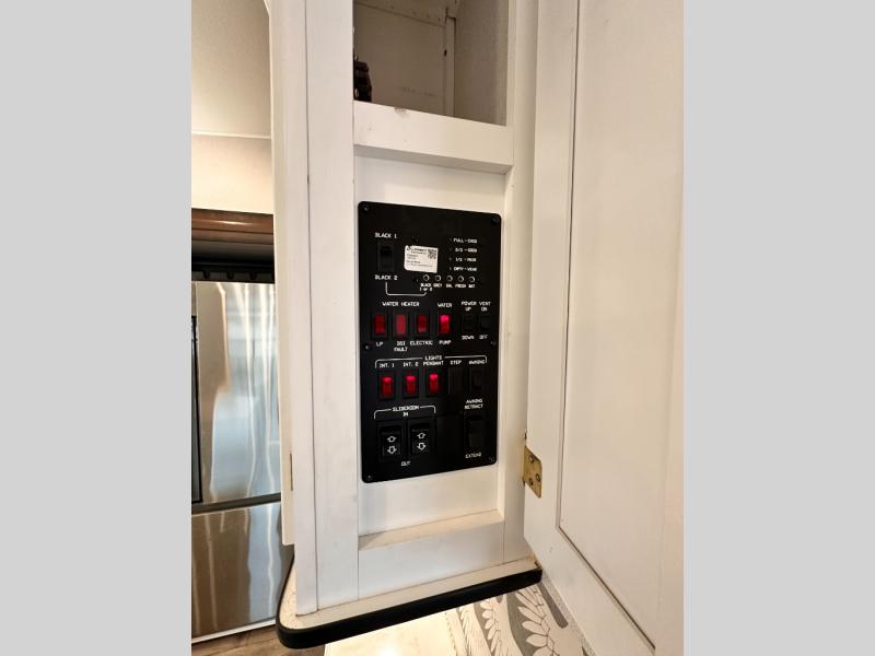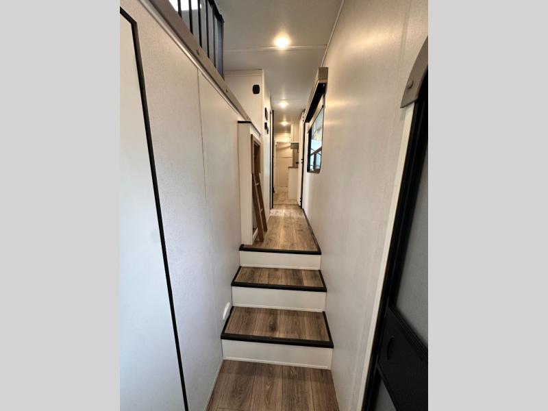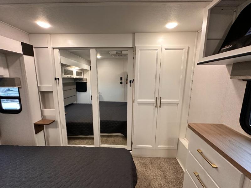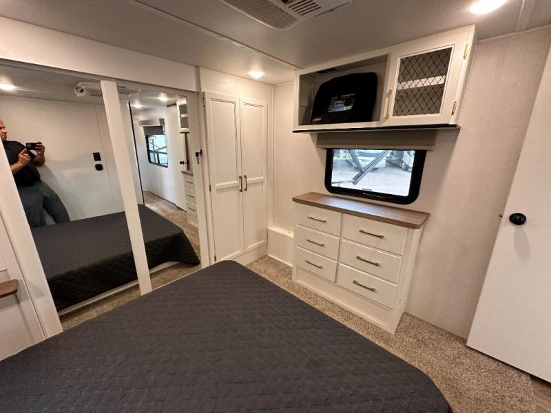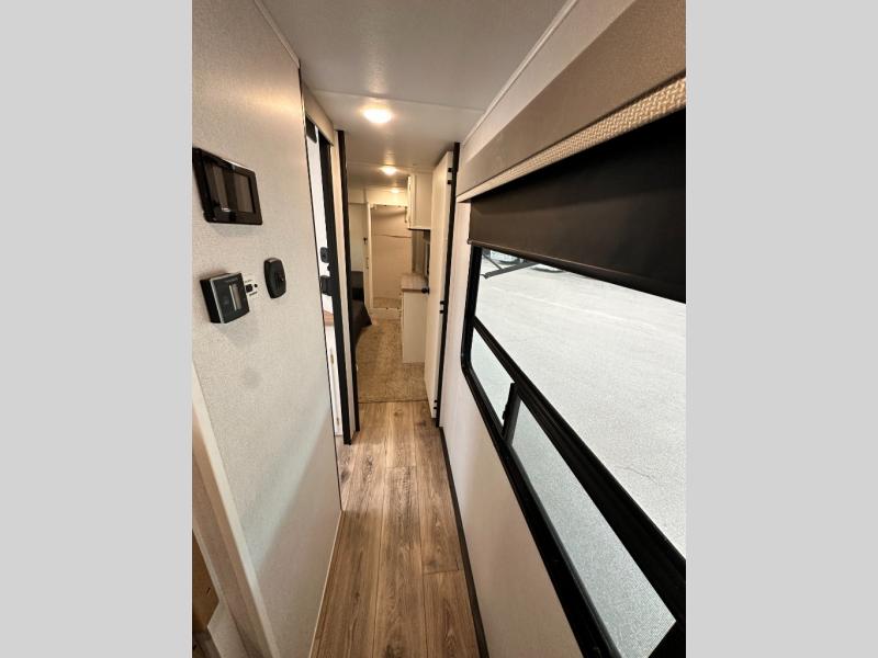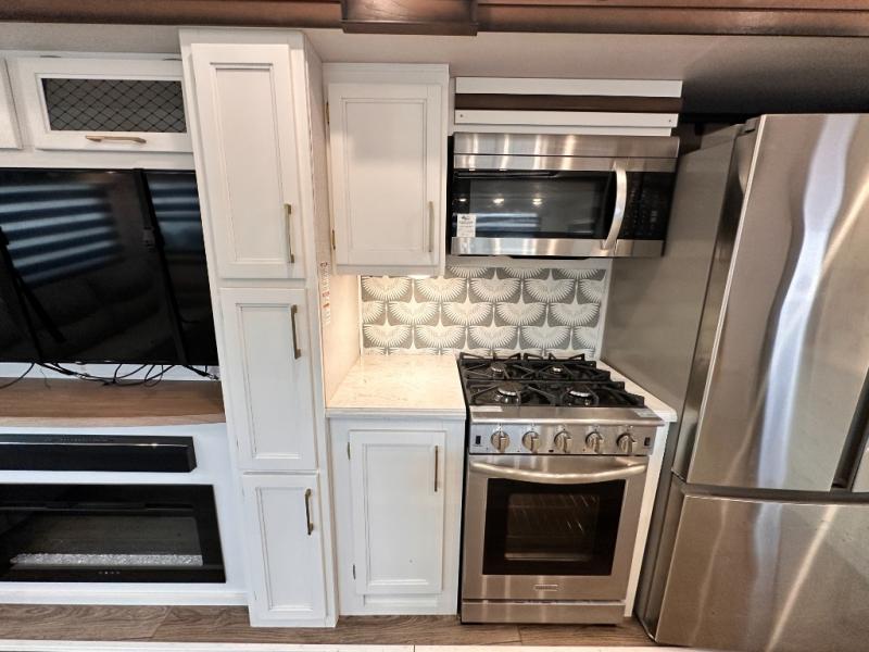 This fifth wheel is one your whole crew will love thanks to the middle bunkroom with a "Sleep & Play" sofa and an upper bunk! You will enjoy the front private bedroom all to yourselves with a king bed slide out, a large closet with washer and dryer prep, plus a dresser for more storage. When you're not outdoors relaxing under the 19' electric awning with LED lights, head to the rear living area to sit back on the theater seating or the hide-a-bed sofa. You'll also find an LED TV here and a booth dinette for game night. The chef will love the outside kitchen just as much as the indoor kitchen with a butcher block top, two pantries, plus a 30" residential style microwave!