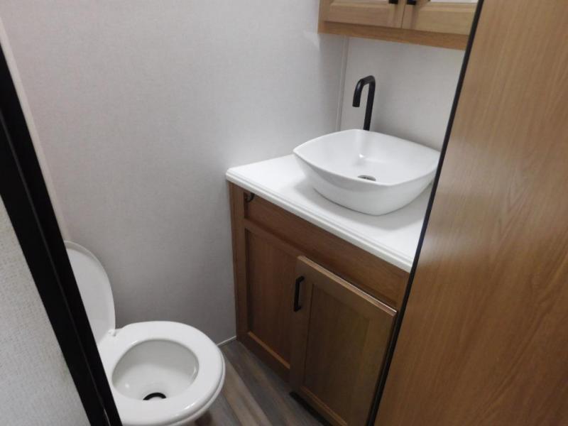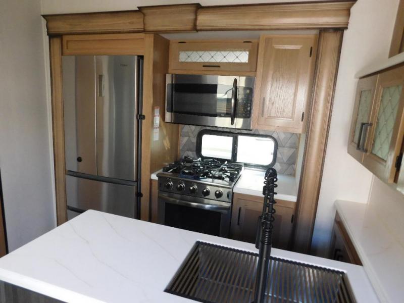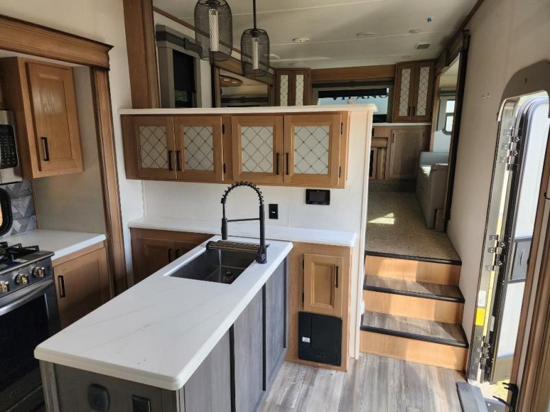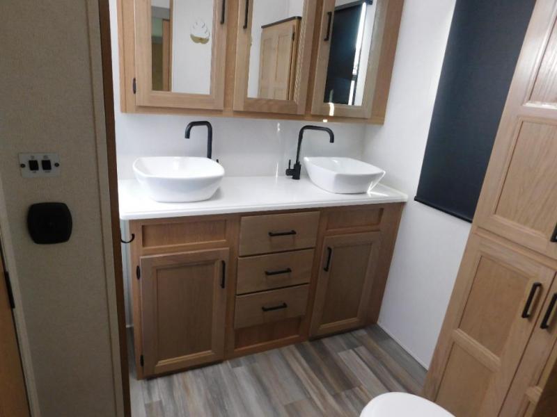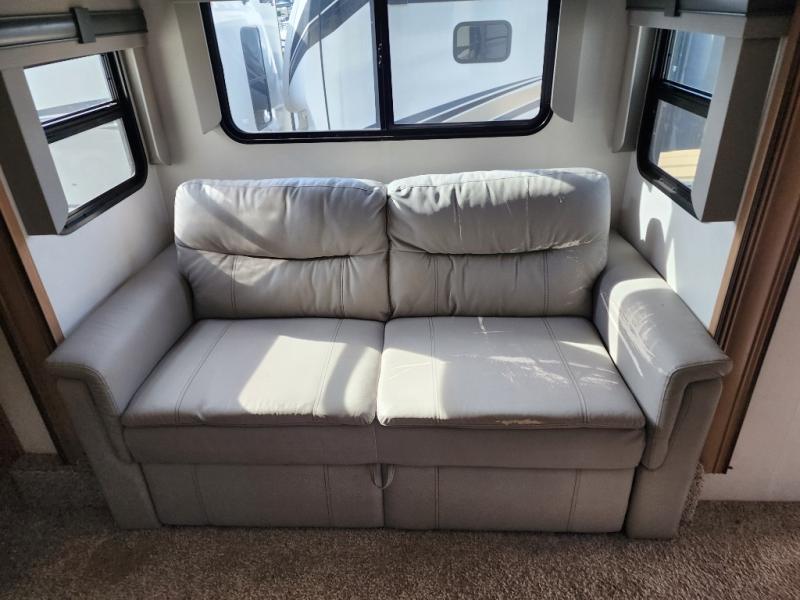 It's a clean decision with a bath and a half to take this fifth wheel on your next adventure! The front living area includes opposing EZ glide couches, 65" theater seating, and a front entertainment with a 50" LED pop up TV and fireplace for a cozy evening indoors. You can convert this area to a bedroom at night for the kiddos or guests, and the front windshield will provide natural light during the daytime. Prepare meals on the Furrion four burner cooktop, and leftovers can go in the 15 cu. ft. residential refrigerator. You and your spouse will love the master suite that includes a king bed slide, plenty of storage space, and an entrance into the full rear bathroom with a dual sink vanity to come in handy when getting ready each day. There is even a space prepped to add an optional washer and dryer if you plan to stay awhile!