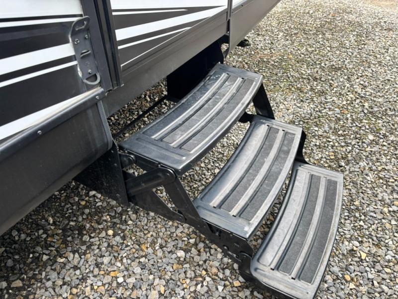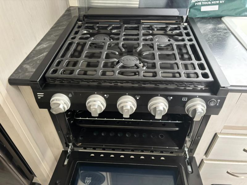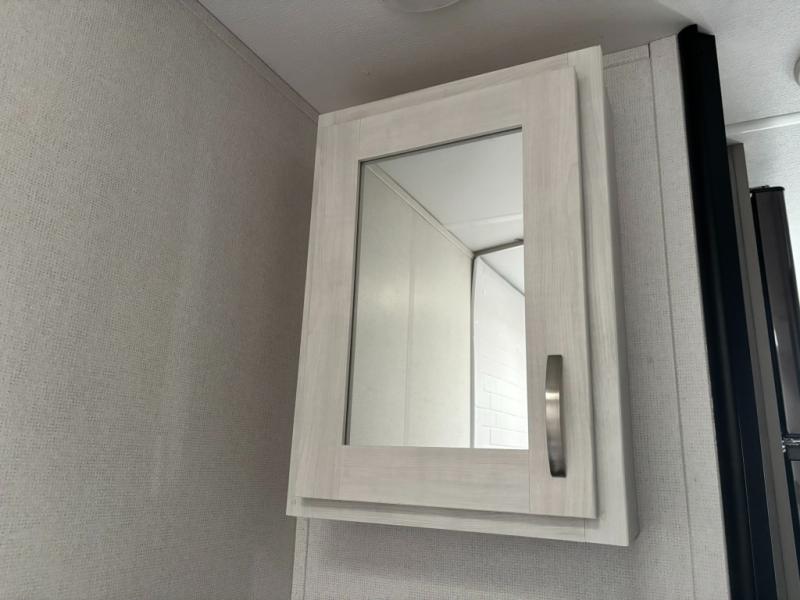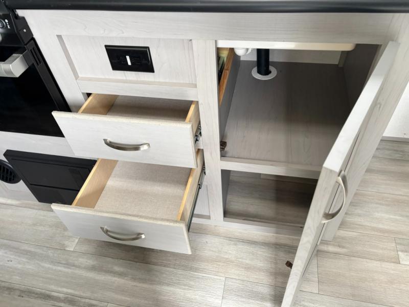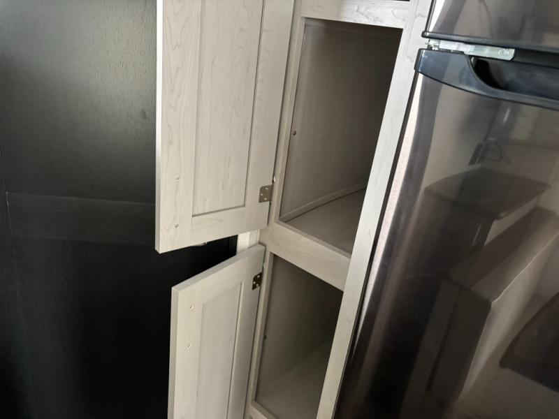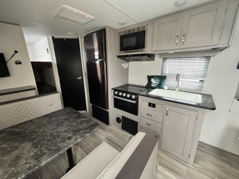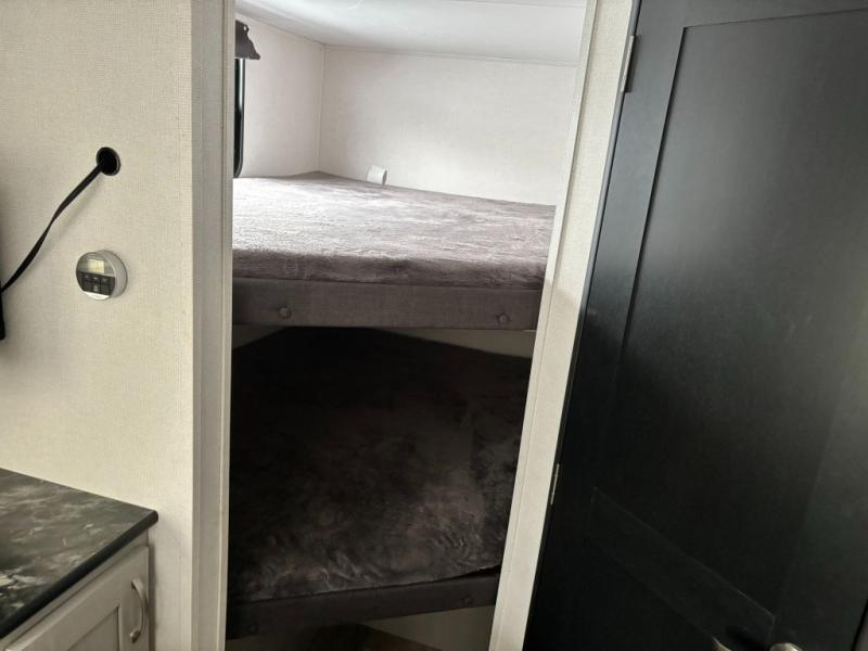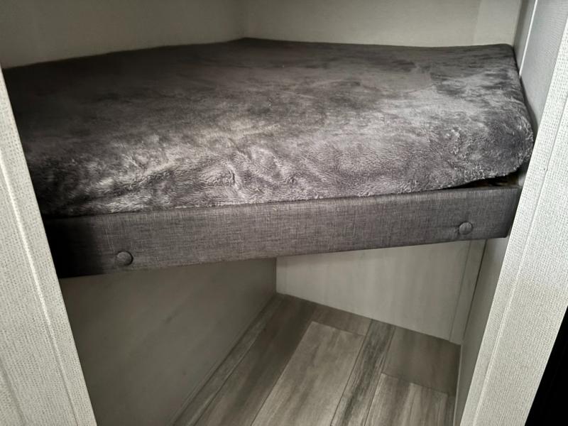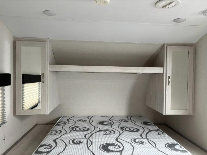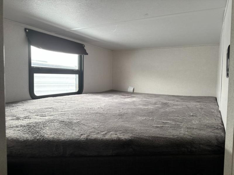 If you are searching for bunk beds, this trailer offers the double-size version! And you will love the easy towing and gasoline savings when heading to your campsite. There is a full-size dinette that doubles as sleeping space and offers storage, kitchen appliances and a pantry, plus a full bathroom with a full-size shower. And the front queen bed allows you access on either side and includes dual wardrobes. So load up and enjoy!