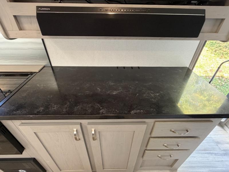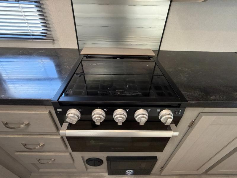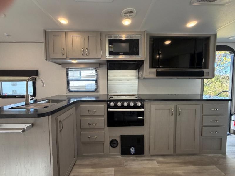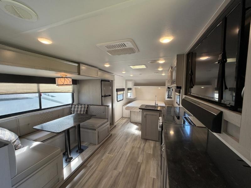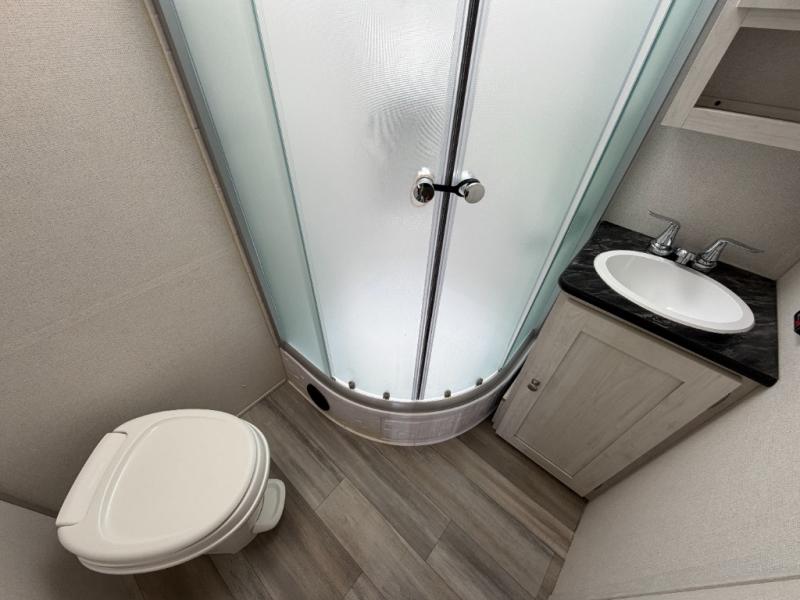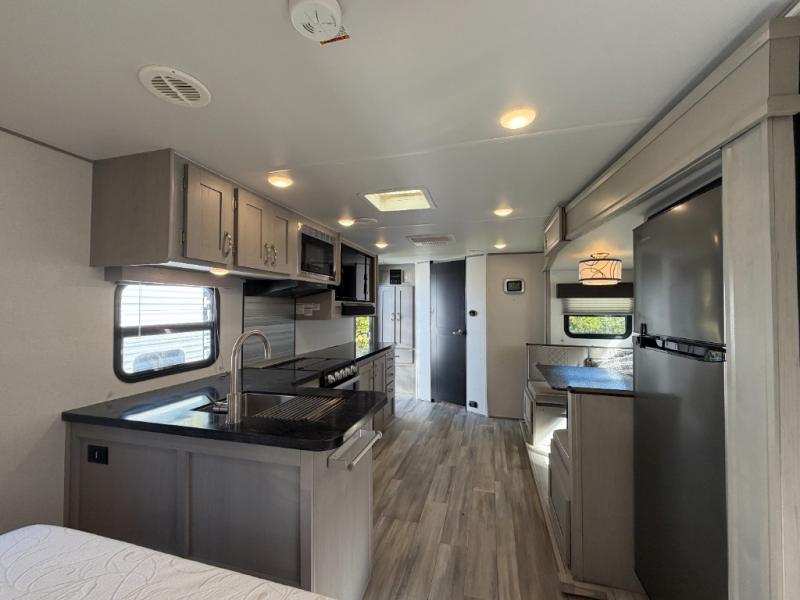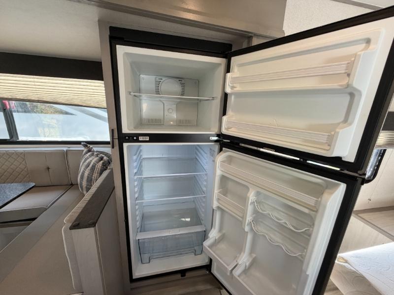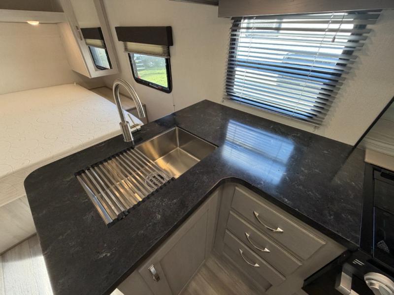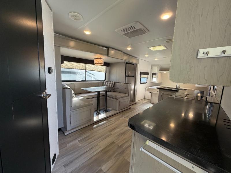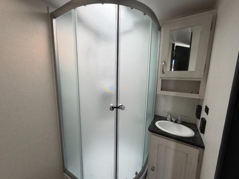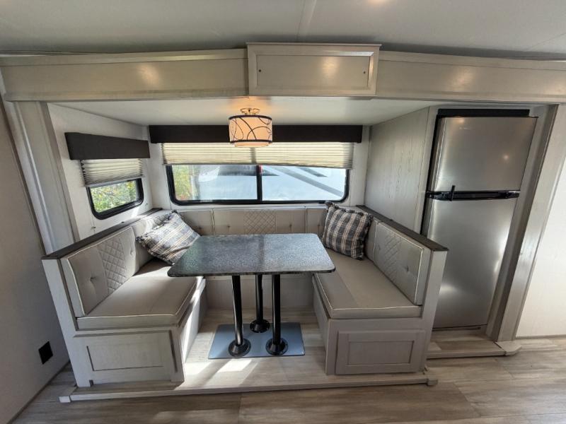This is a perfect couple's trailer with the front walk-around queen bed including nightstands and wardrobe cabinets on each side, plus additional shelving above, and the main area slide out provides more interior space to move about. The U-shaped dinette offers a place to dine, play games and relax as well as sleep allowing you to offer overnight guests sleeping arrangements, plus the large two-door refrigerator makes it easy to grab a drink before sitting down. The kitchen also offers a stovetop and oven, a range hood, a microwave, and an L-shaped counter with a farm-style sink. And the corner full bathroom provides a space-savings radius shower.