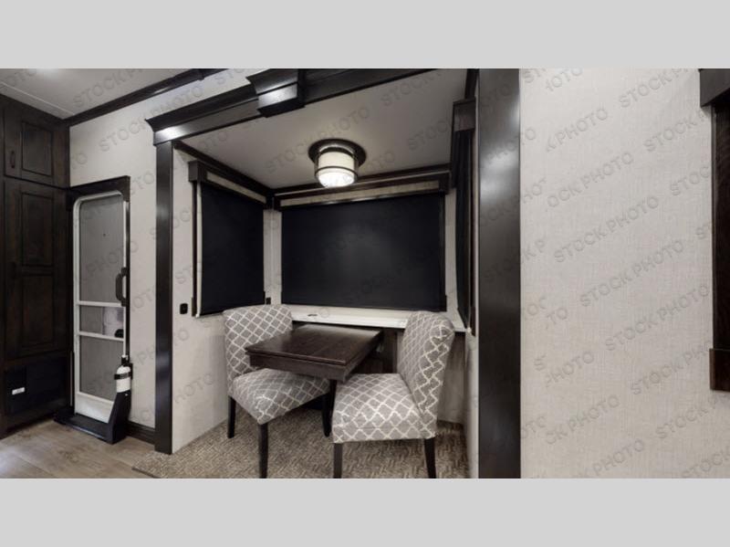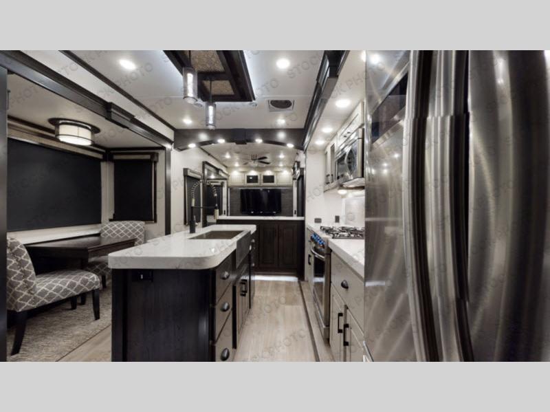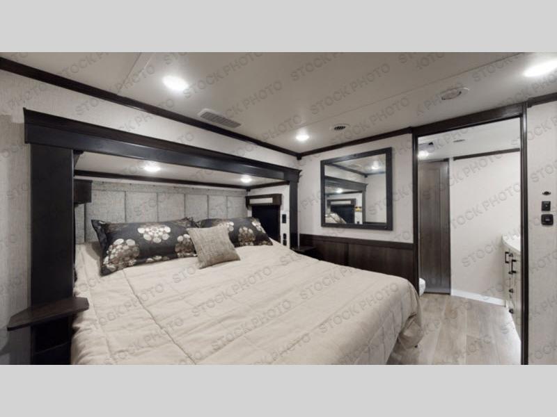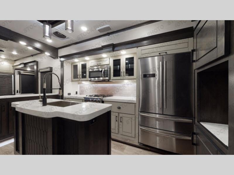 This Redwood fifth wheel is going to make you say wow! The rear living room is fully impressive with its 72" tri-fold sofa slides that are across from one another, its 60" theater sofa, its entertainment center with 65" TV, and its ceiling fan. All in all, it will feel like you're lounging back at home. The kitchen is also completely decked out with opposing slides, a pull-out waste basket at the large island, two buffets, a pantry, and a message center, and just a few steps away from the kitchen is where you will find the luxurious master suite. This space has a full bathroom up at the front where you will find a huge walk-in closet, and within the bedroom, the king bed slide rests across from the 39" TV so that you can watch a movie in comfort.