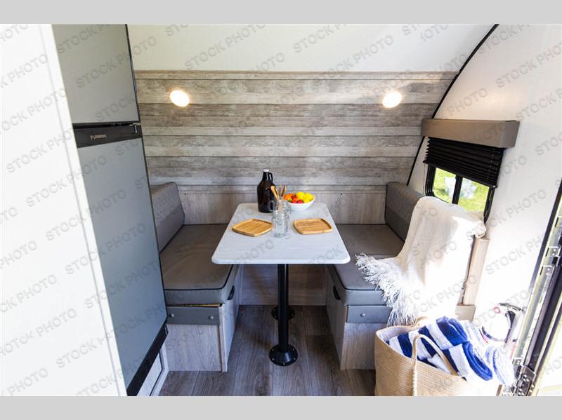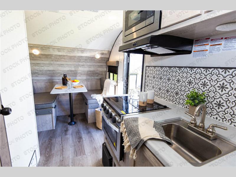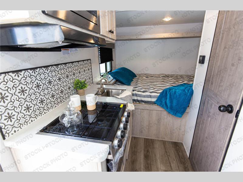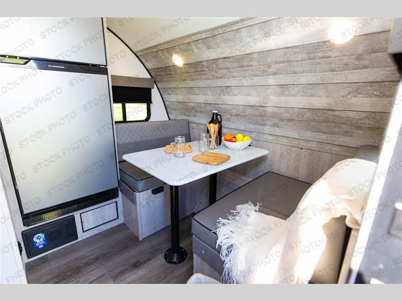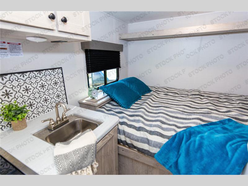 Comfort is found in this single axle travel trailer for three. You can prepare your own meals each day in the kitchen, and dine together at the booth dinette. If you'd rather have a sofa with a table, you can add that option in place of the dinette. There is a private toilet and shower for you to freshen up each day, and the rear 60" x 76" RV queen bed will make you feel right at home. No more sleeping on the floor!