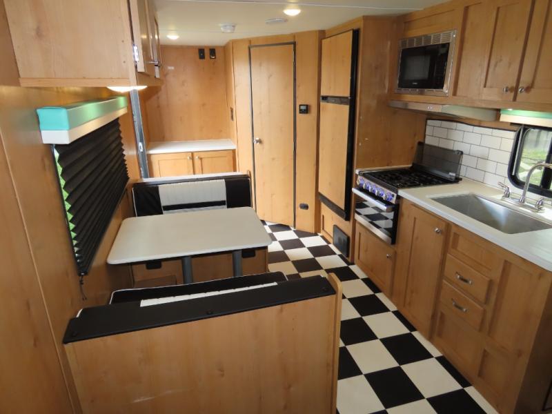 Ditch that old tent for this double-axle travel trailer for three. You will love being able to make your meals on a four burner cooktop instead of a fire each night, and there is a full bath to clean up in after swimming in the lake. The booth dinette will be perfect for meal times, game night, and additional sleeping space, plus there is an RV queen bed in the front bedroom for you. If the weather isn't too hot you may just find yourselves outdoors more under the 11' patio awning!