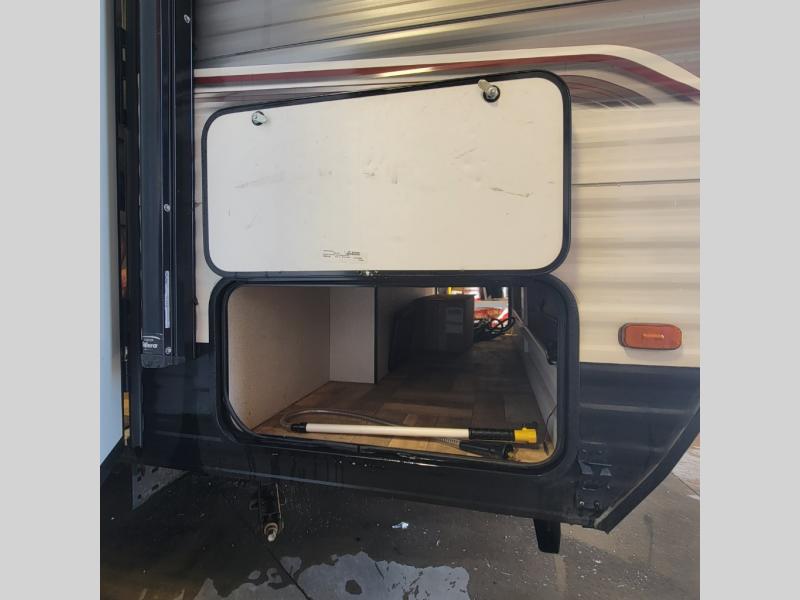 Compact and full of features for you and your family to enjoy camping! There is an RV queen bed up front to sleep comfortably, and a set of bunk beds next to the full bathroom in the rear. Someone might even sleep on the booth dinette once easily setup for nighttime. The galley kitchen offers full amenities to make meals, and you will find storage throughout in overhead cabinets. And you can bring along those larger camping items like fishing poles, camping chairs and outdoor games in the pass-through compartment.