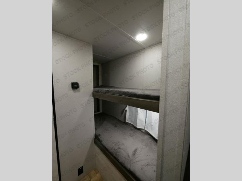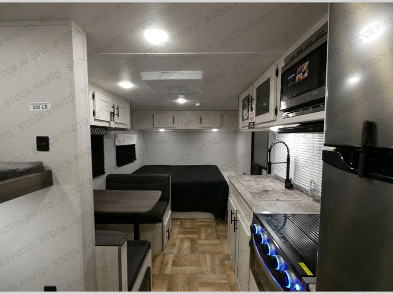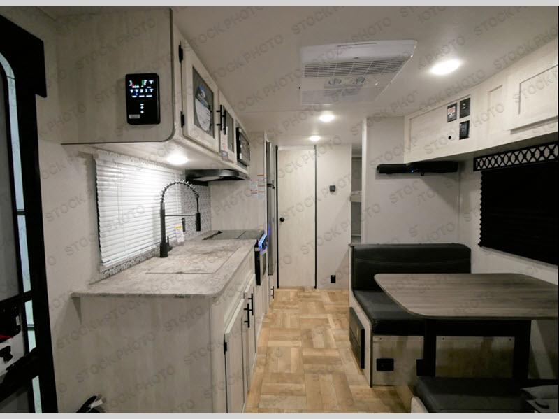 Compact and full of features for you and your family to enjoy camping! There is an RV queen bed up front to sleep comfortably, and a set of bunk beds next to the full bathroom in the rear. Someone might even sleep on the booth dinette once easily setup for nighttime. The galley kitchen offers full amenities to make meals, and you will find storage throughout in overhead cabinets. And you can bring along those larger camping items like fishing poles, camping chairs and outdoor games in the pass-through compartment.