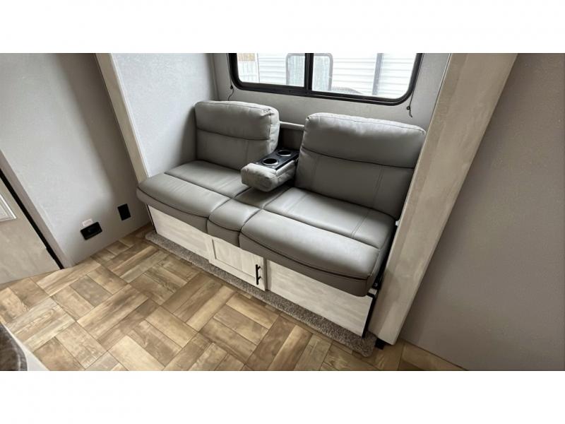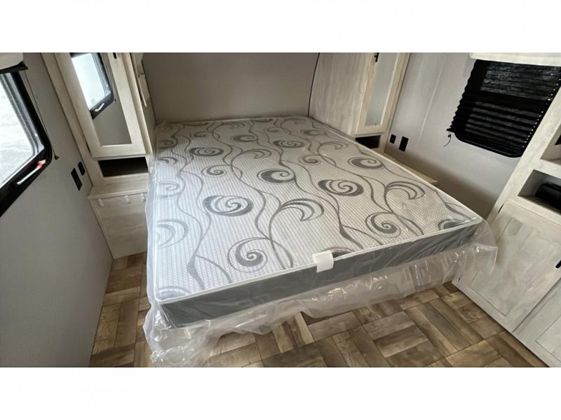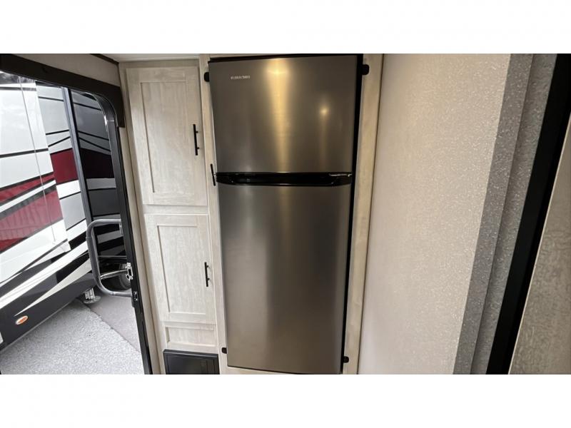 The light cabinetry and a cozy sofa plus the extra floor space from the slide out allow you to relax and unwind before exploring outdoors! There is a pantry and 10 cu. ft. refrigerator as you enter, and the kitchen has an L-shaped counter with extended countertop along one side. There is an entertainment center, a walk-around RV queen bed up front with wardrobes and an overhead cabinet for storage. The rear corner bathroom is complete with a 24" x 40" shower and linen storage. And the pass-through compartment allows for the larger items like camping chairs and outdoor tables, while the power awning provides some protection from the elements.
