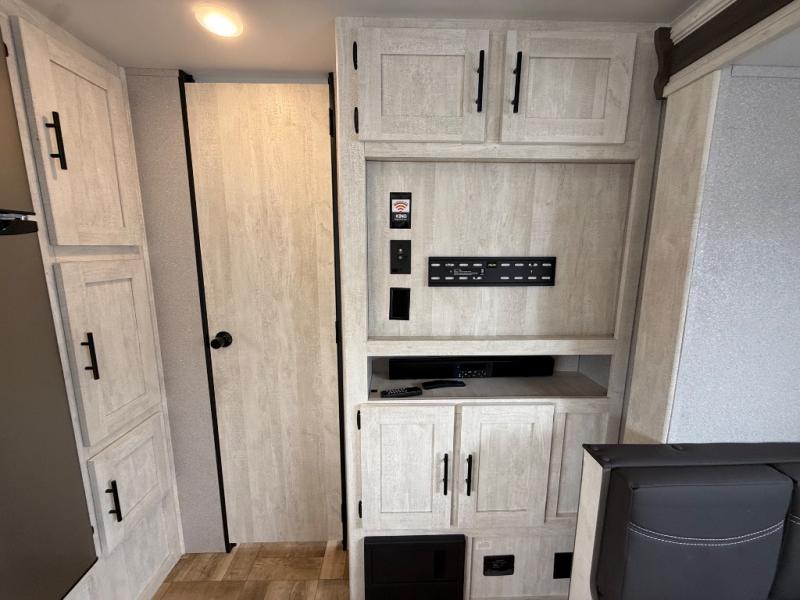 Whether you camp locally or far away, you will be able to enjoy a spacious interior and privacy in this trailer! From the rear full bathroom with upper cabinet and linen storage and a shower to the front bedroom with a door to close when you are ready for bed, privacy is no issue. The walk-around RV queen bed offers dual wardrobes and access to the pass-through storage under the bed. The combined living and kitchen provides more floor space thanks to the slide out U-shaped dinette, and the sofa provides more seating. The cook will love the galley kitchen with everything nearby including a pantry. Yet the outside kitchen will give them choices when making meals.