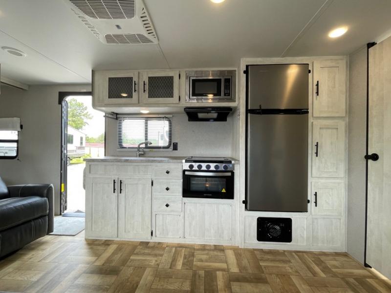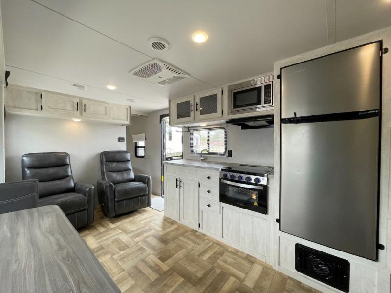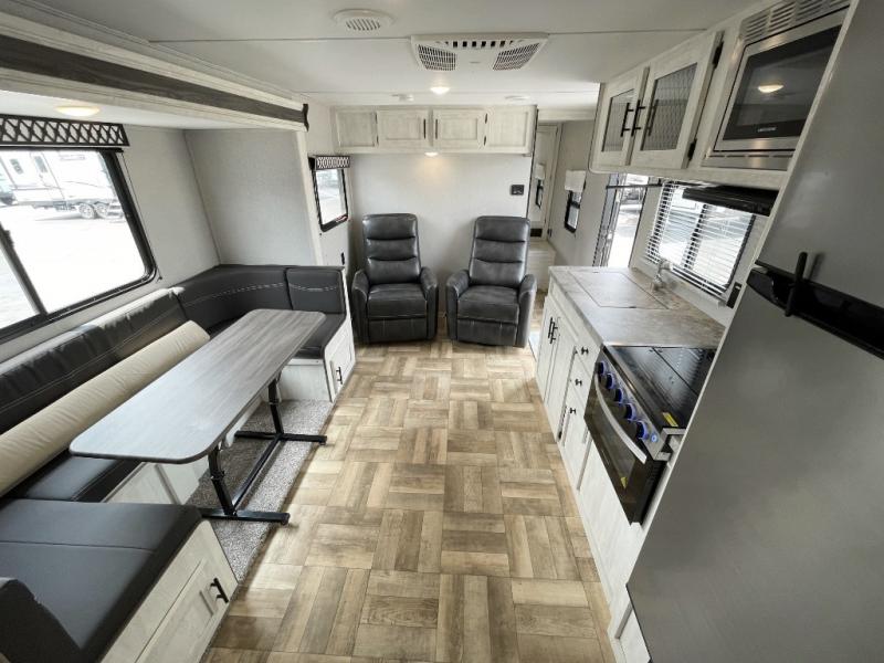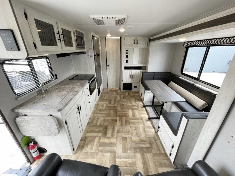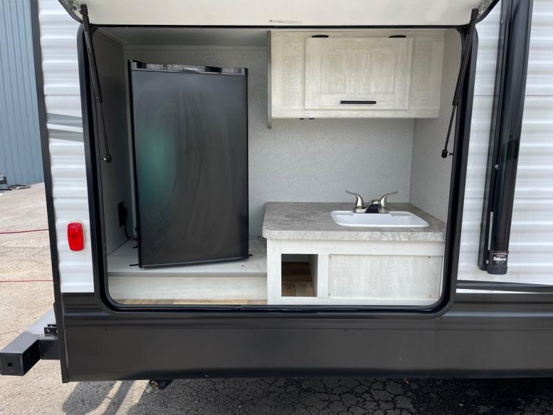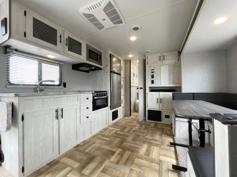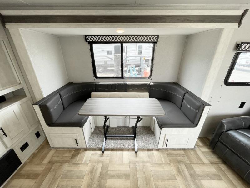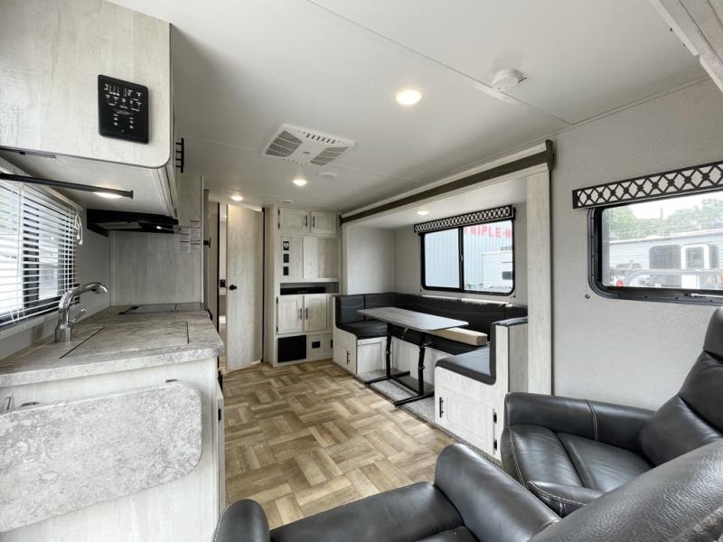 Whether you camp locally or far away, you will be able to enjoy a spacious interior and privacy in this trailer! From the rear full bathroom with upper cabinet and linen storage and a shower to the front bedroom with a door to close when you are ready for bed, privacy is no issue. The walk-around RV queen bed offers dual wardrobes and access to the pass-through storage under the bed. The combined living and kitchen provides more floor space thanks to the slide out U-shaped dinette, and the sofa provides more seating. The cook will love the galley kitchen with everything nearby including a pantry. Yet the outside kitchen will give them choices when making meals.
