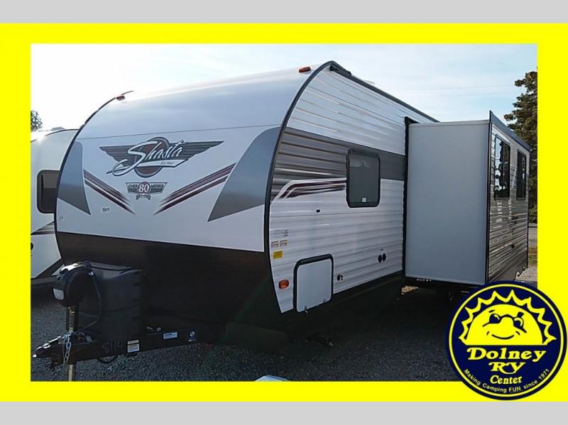 With each Shasta travel trailer by Shasta RVs, premium wood products are used such as 2x2 wall studs on 16" centers and 5/8" thick tongue and groove plywood floors. The 5" wood roof trusses support full walk-on roof decking wrapped with a seamless PVC membrane. Also included is a aerodynamic radius front profile, a front colored rock guard to protect against road debris, a straight axle with electric brakes, molded rain gutter with extra long spouts, a power tongue jack for easy setup, plus an oversized, lighted pass-through compartment with exterior access, and interior access under the bed. The interior offers decorative cabinet pulls, lighted cupholders with two USB chargers, a stainless steel sink, and more providing value and convenience. Rest easy when you purchase a lightweight Shasta that is built to last!