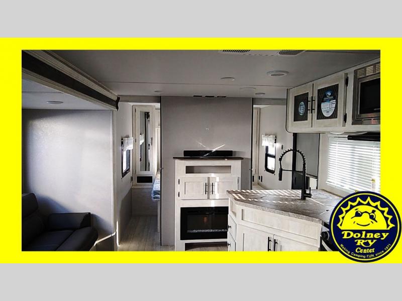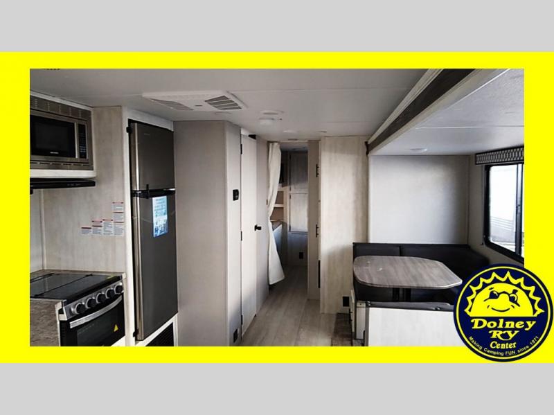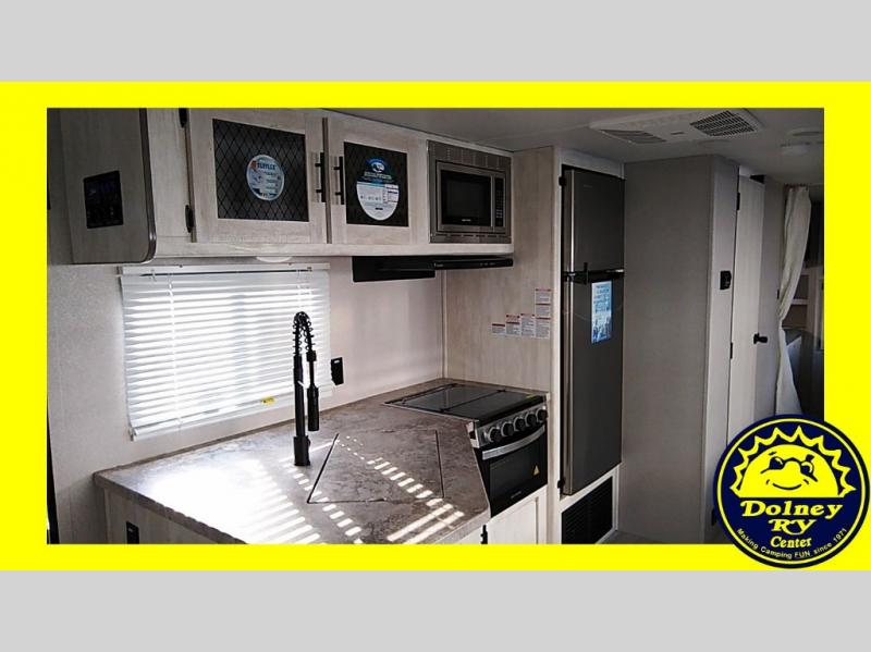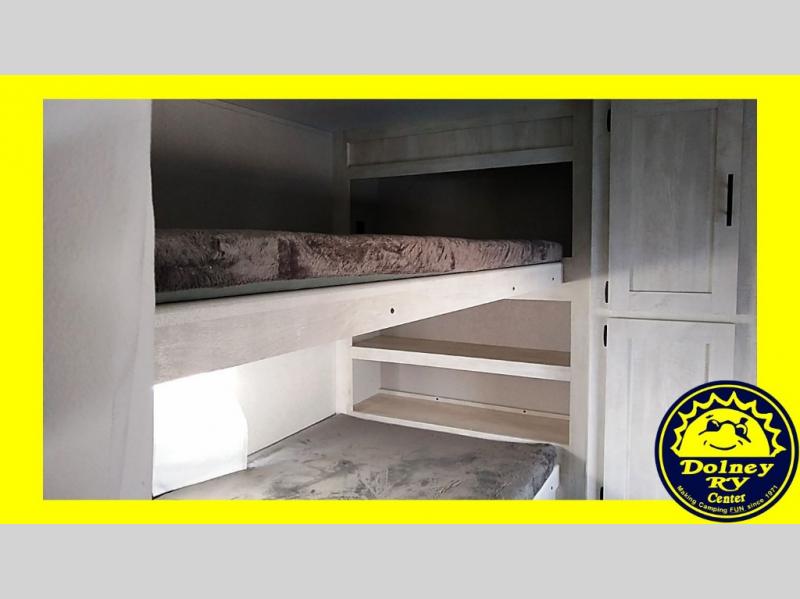 When you have the choice to camp with your own accommodations or stay home, you know which is the more fun and relaxing choice! This Shasta offers so many features you might have multiple favorites. There is a rear private bunkhouse with four bunks beds, dual bunk storage and a wardrobe to keep everything tidy. However, you might like to choose the flip-up bunk over a mini dinette option if you prefer that setup. The full bathroom is complete with a shower and allows everyone to get cleaned up before bedtime. The kitchen offers full amenities as well as a pantry to store the dry goods and snacks, and you can dine at the U-shaped dinette or while sitting on the sofa, both furnishings are with a slide out. And there is a front bedroom with dual entry for easy access, an RV queen bed and more storage. And don't forget about the power awning that offers a covered area to relax under and you might like to add the optional mini outside kitchen for more choices when cooking for everyone.