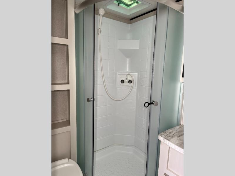 It's time to head out for some camping fun and relaxation in this trailer that easily accommodates a couple or group of three to four! There is a front bedroom with a privacy curtain and a walk-around bed with dual wardrobes and windows for views of your campsite. You can dine at the jackknife sofa slide with table as well as work or play games in this space, then at night the furniture provides extra sleeping space. Everyone can take turns getting cleaned up in the full corner bathroom with a radius shower, and some might like to relax under the 12' power awning before calling it a night. There are options you might like to add such as an 8 cu. ft. refrigerator, a 15,000 BTU A/C, electric stabilizer jacks, and/or an LED TV.