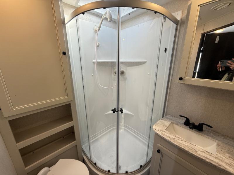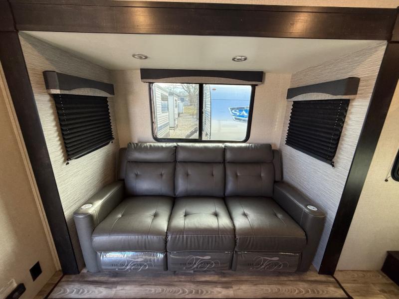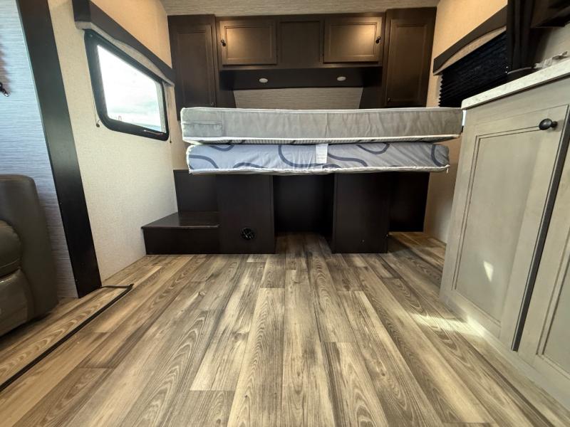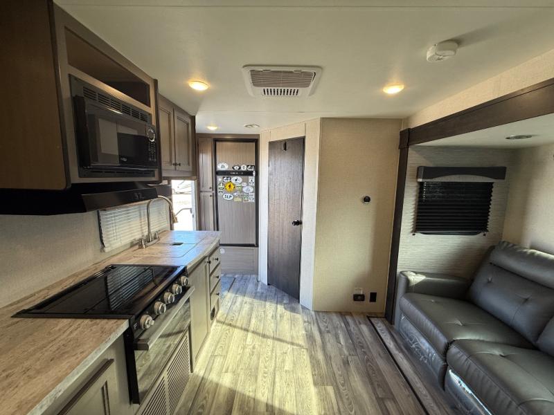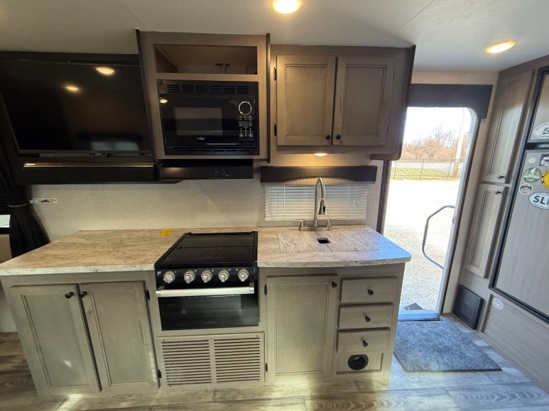 Get ready for some fun and relaxation with this trailer setup at your favorite campground! After enjoying the outdoors and everything it has to offer, you can whip up a meal in the galley kitchen with full amenities and clean the dishes with a single basin stainless steel under-mount kitchen sink with a residential high-rise faucet with pull-down sprayer. The LED HDTV will provide inside entertainment as you relax on the L-shaped sofa with table to dine at, and this space doubles as a sleeping area at night. The front bedroom offers a privacy curtain, a queen bed with under bed storage, dual wardrobes, a laundry chute, and electric outlets and USB ports. And everyone can take turns getting cleaned up in the rear corner bathroom which offers linen storage after hanging out under the 12' power awning.