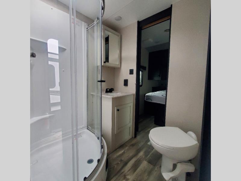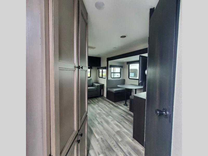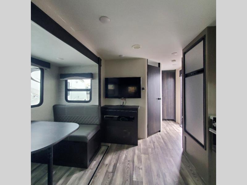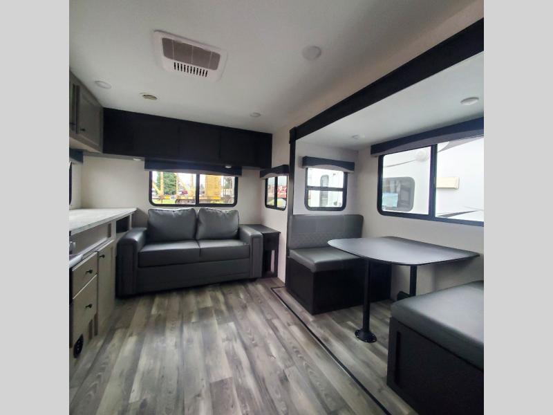 Venture to see new places with this trailer in tow. You can easily setup the booth dinette slide, the 18' power awning, and start relaxing or exploring outdoors! The rear tri-fold sofa has an end table and kitchen counter space to place your things when the cook doesn't need the counter space to prepare and serve meals. The corner pantry will come in handy when loading and unloading as well as grabbing goodies as you exit the trailer. Everyone can watch the LED HDTV while dining at the dinette, and both of the furnishings in this area offer sleeping space at night. The dual-entry bath is convenient for all, and the front master will give you an escape with a queen bed, dual wardrobes, a laundry chute and windows for views of your campsite. You might even like to choose from a few options such as a table and chairs, a table, chairs and bench, theater seating, WiFi router, and/or an Off-Grid Solar package.