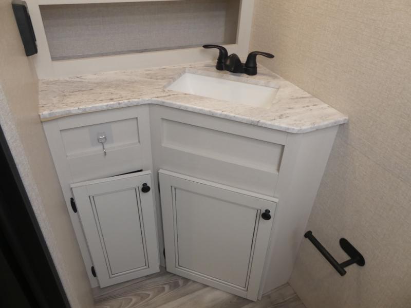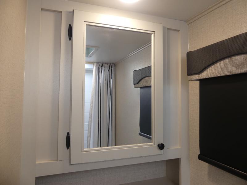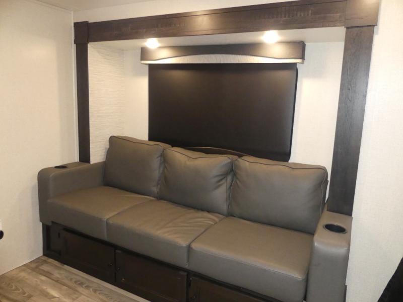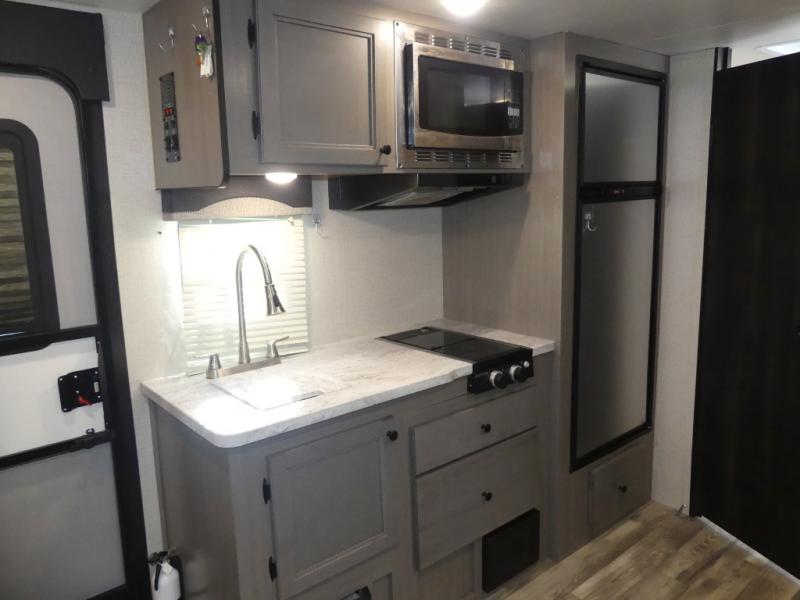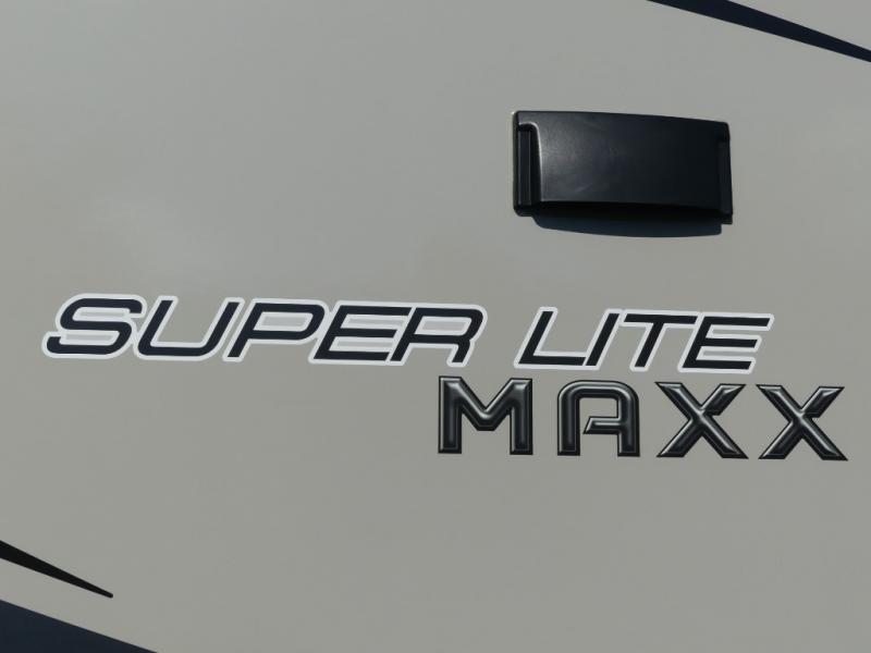 Anytime you take this Super Lite Maxx travel trailer out to the campsite, you'll feel good about the decision! This trailer makes life easy with its skylight and tub/shower in the full rear bathroom, its two-burner recessed range and convection microwave in the kitchen, and its jackknife sofa and 80" bed for sleeping. Another great aspect of this trailer is its storage space. There is a bathroom linen closet, overhead cabinets, an 8-cubic foot refrigerator, and exterior storage compartments. The residential vinyl flooring will be easy to clean if any messes are made, and since there are no floor heat registers, this trailer is very accommodating for kids and pets.
