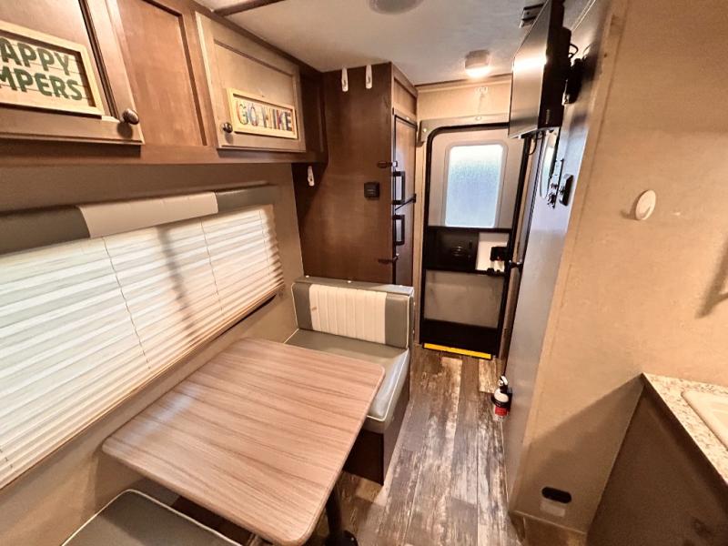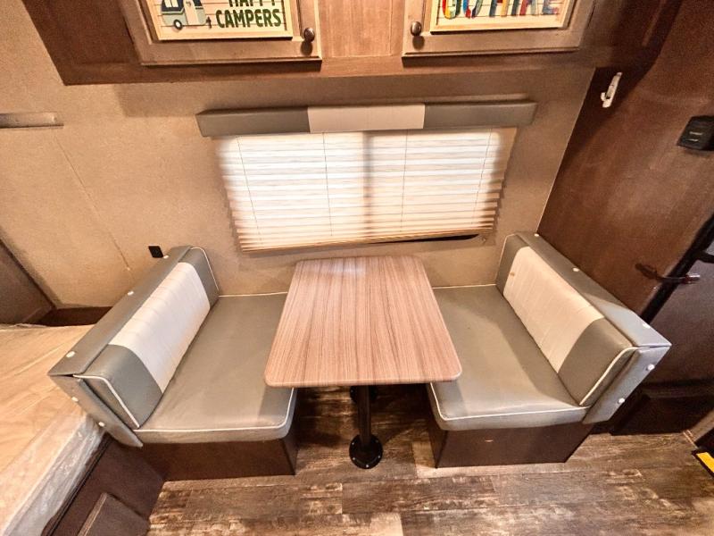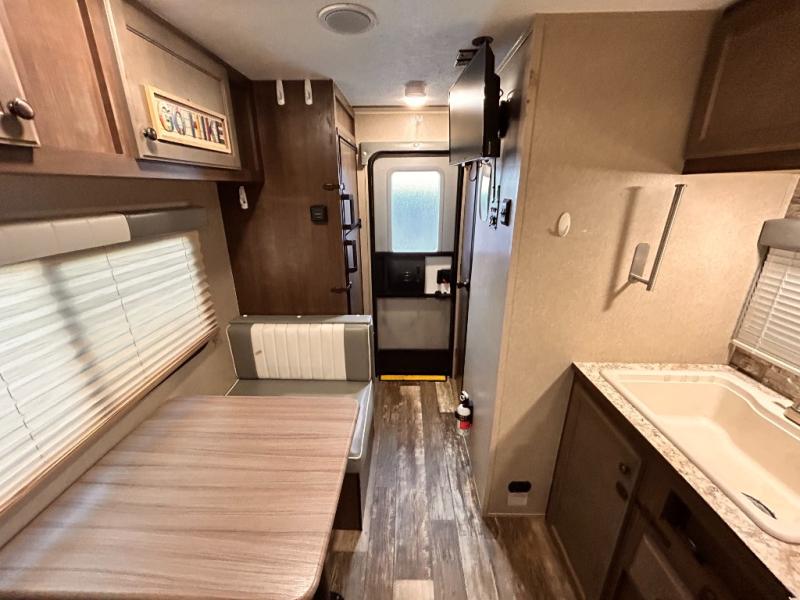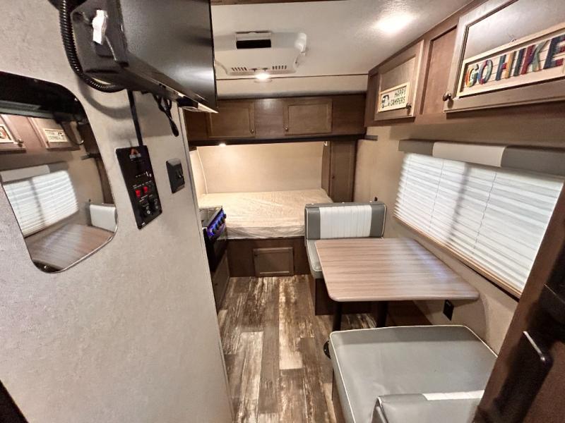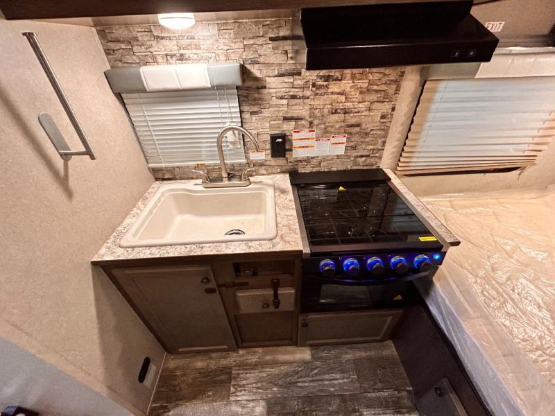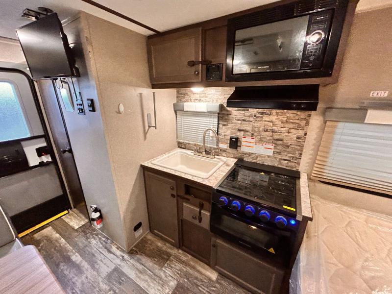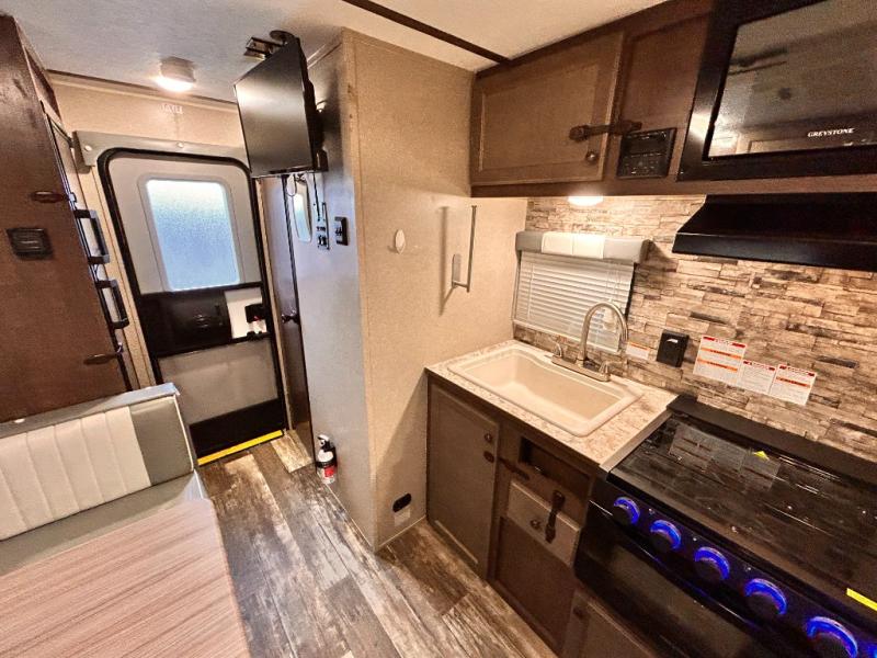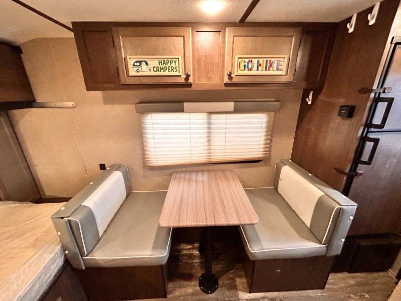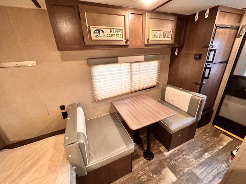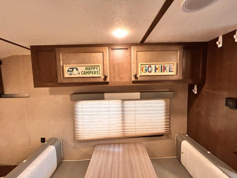 This travel trailer is perfect for couples who want to getaway together! The front bed offers a comfortable place to lay your head at night. When you're not using the booth dinette to enjoy a meal that you prepared with the two burner cooktop or playing a card game, you can transform it into an extra sleeping space. You can start your mornings feeling clean and fresh after showering in the tub with unwanted steam removed with the power roof vent.