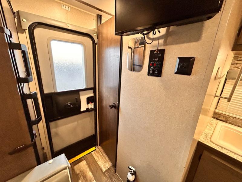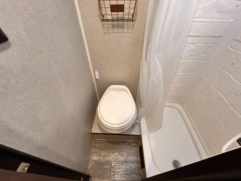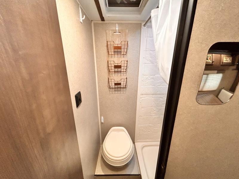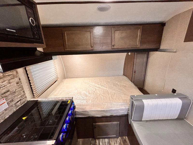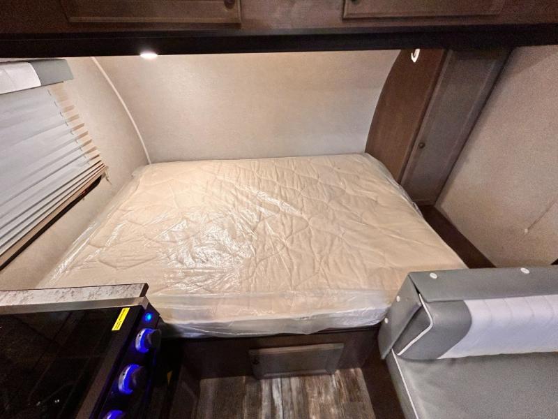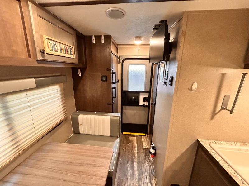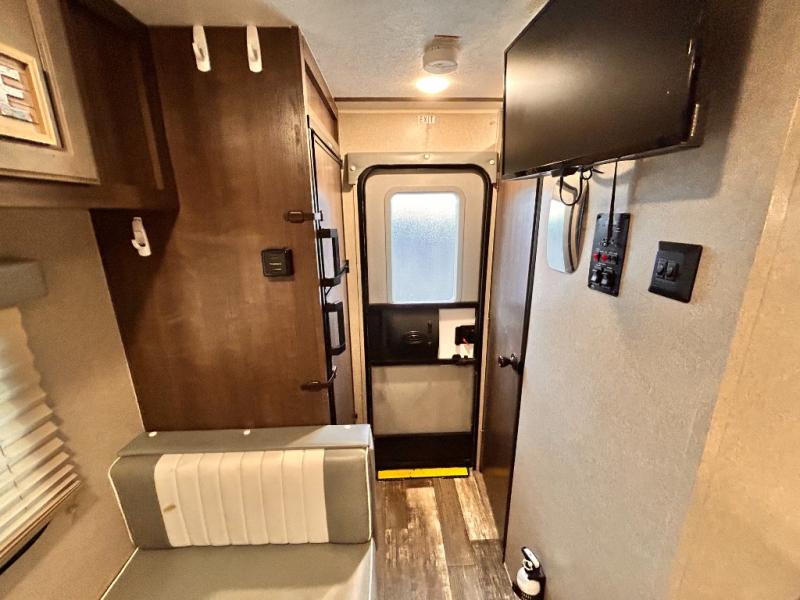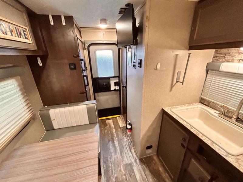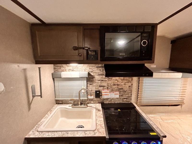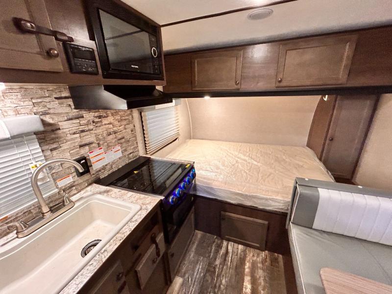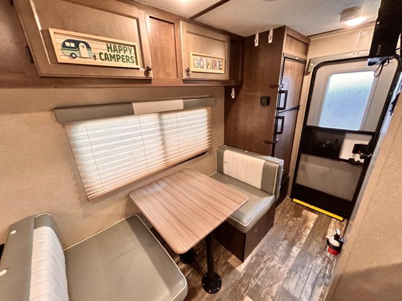 This travel trailer is perfect for couples who want to getaway together! The front bed offers a comfortable place to lay your head at night. When you're not using the booth dinette to enjoy a meal that you prepared with the two burner cooktop or playing a card game, you can transform it into an extra sleeping space. You can start your mornings feeling clean and fresh after showering in the tub with unwanted steam removed with the power roof vent.