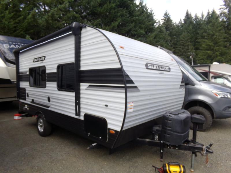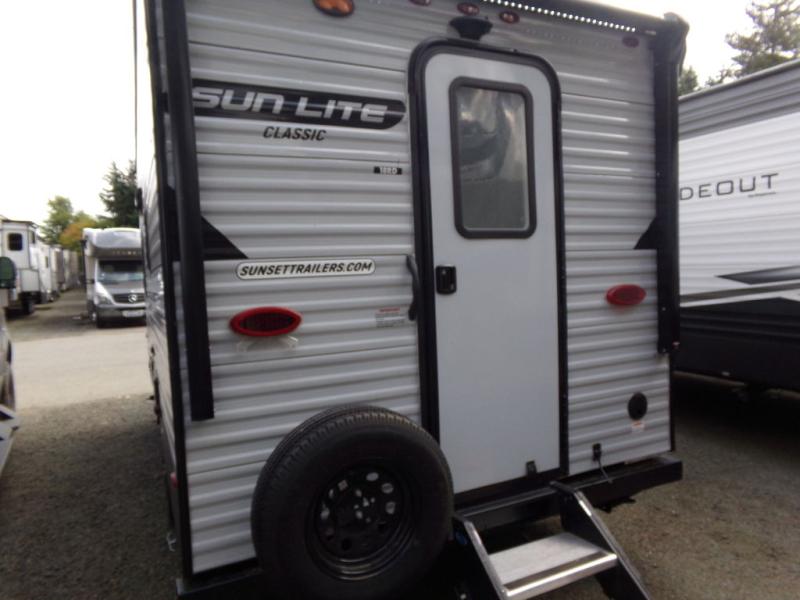 You can trust the build and enjoy your experience with any one of these Sunset Park RV Sun-Lite Classic travel trailers! Their aerodynamic profile is not only easy to haul, but also saves on fuel. They are built to withstand years of traveling even though they are lightweight with a diamond plate rock guard, a one piece PVC roof membrane, EZ lube electric brake axles, and radius tinted safety glass windows with nightshades for added privacy. The mandatory Comfort package includes a Bluetooth radio with inside and outside speakers, a quick connect gas line, a microwave, and an outside shower to help keep the dirt outdoors where it belongs. Call Kitsap RV at 360-377-0207 with questions or to schedule a viewing appointment!