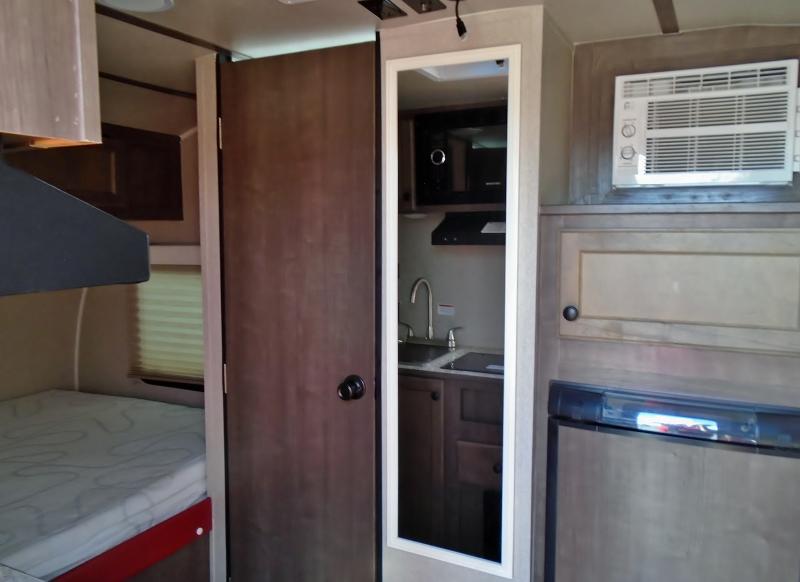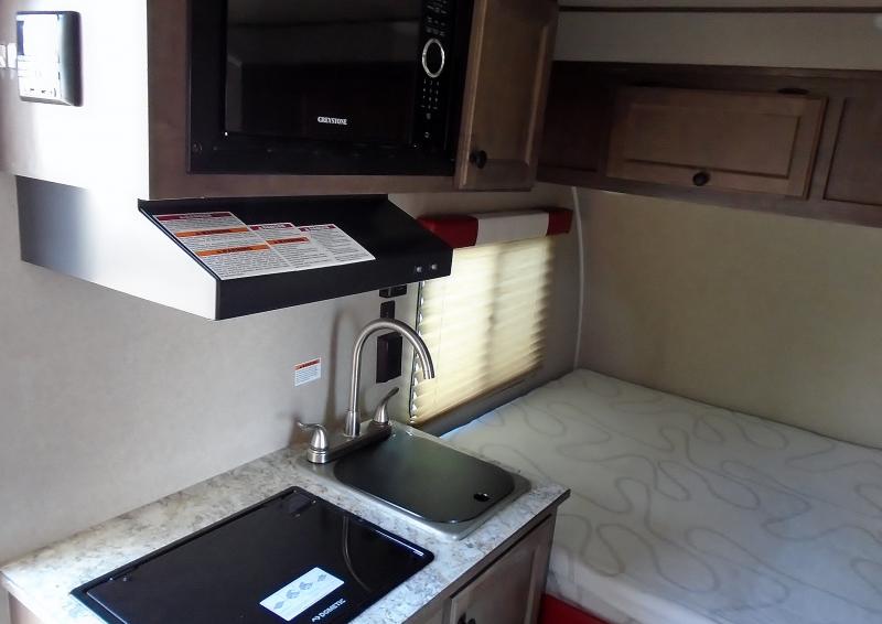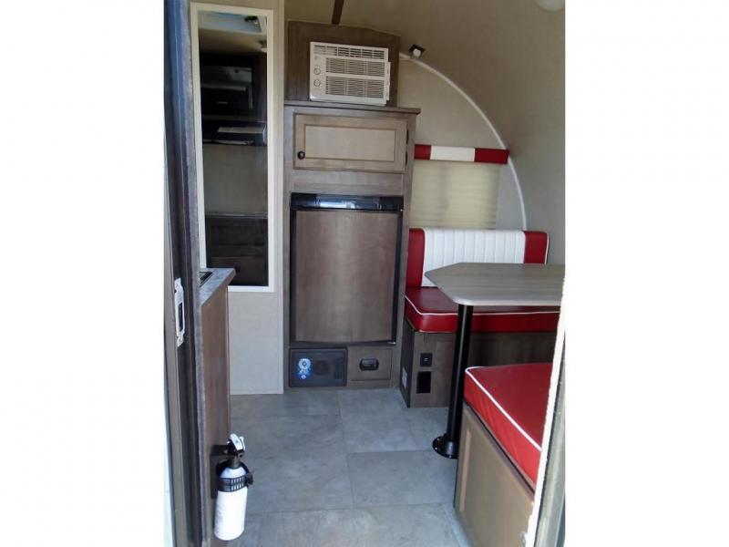 This Sunray travel trailer is the largest and most accommodating because it comes with a wet bath so that you can even take a shower in your trailer! There is a small kitchen on the interior that comes with a two-burner stove top, a refrigerator, and a microwave so that you can cook dinner without having to start a fire, and since it is indoors, you will be able to keep the bugs away while you prepare something delicious to eat. If you need to rinse off some gear, the outside shower will be especially useful, and if you need to charge your devices, use the USB ports. You will also find a Wineguard HDTV antenna on this model. Add the available Classic option for 14" tires instead of the off-road version, color matching rims with Moon Caps, and Retro decor and Diner-Style countertops.
