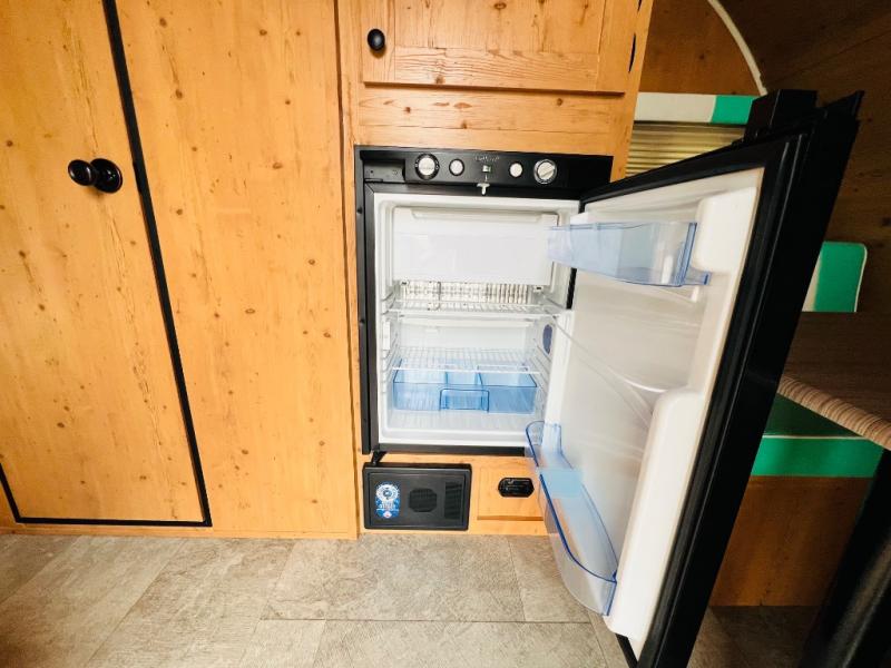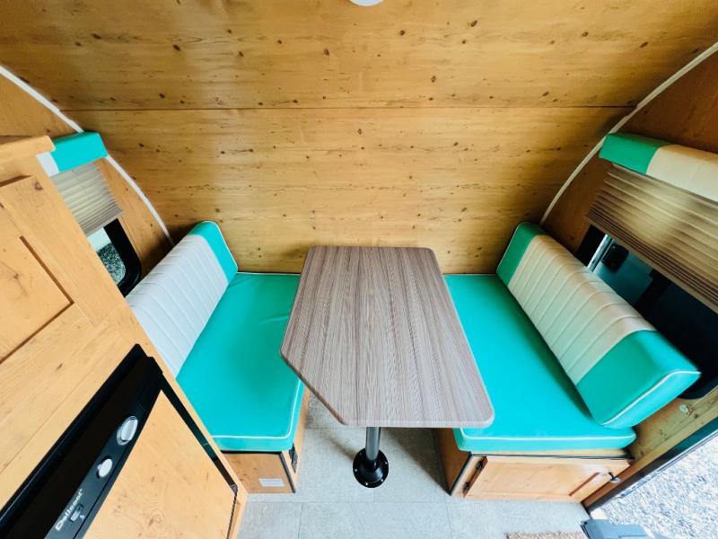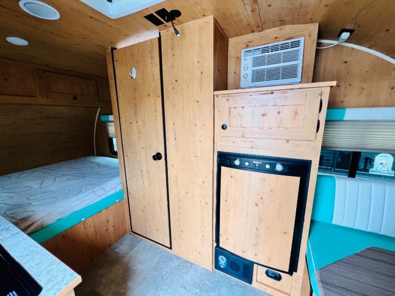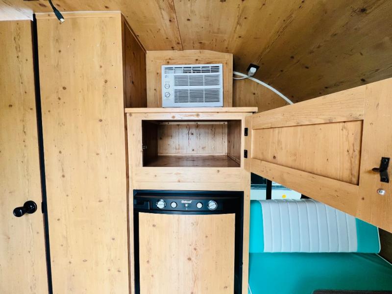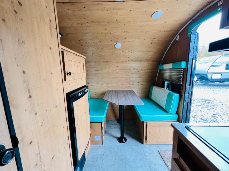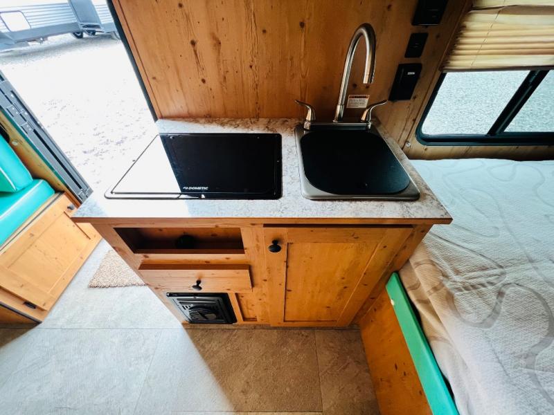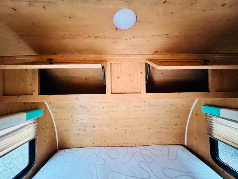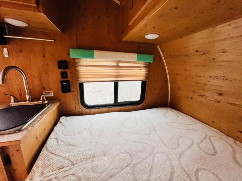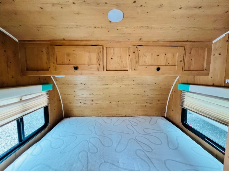 This Sunray travel trailer is the largest and most accommodating because it comes with a wet bath so that you can even take a shower in your trailer! There is a small kitchen on the interior that comes with a two-burner stove top, a refrigerator, and a microwave so that you can cook dinner without having to start a fire, and since it is indoors, you will be able to keep the bugs away while you prepare something delicious to eat. If you need to rinse off some gear, the outside shower will be especially useful, and if you need to charge your devices, use the USB ports. You will also find a Wineguard HDTV antenna on this model. Add the available Classic option for 14" tires instead of the off-road version, color matching rims with Moon Caps, and Retro decor and Diner-Style countertops.