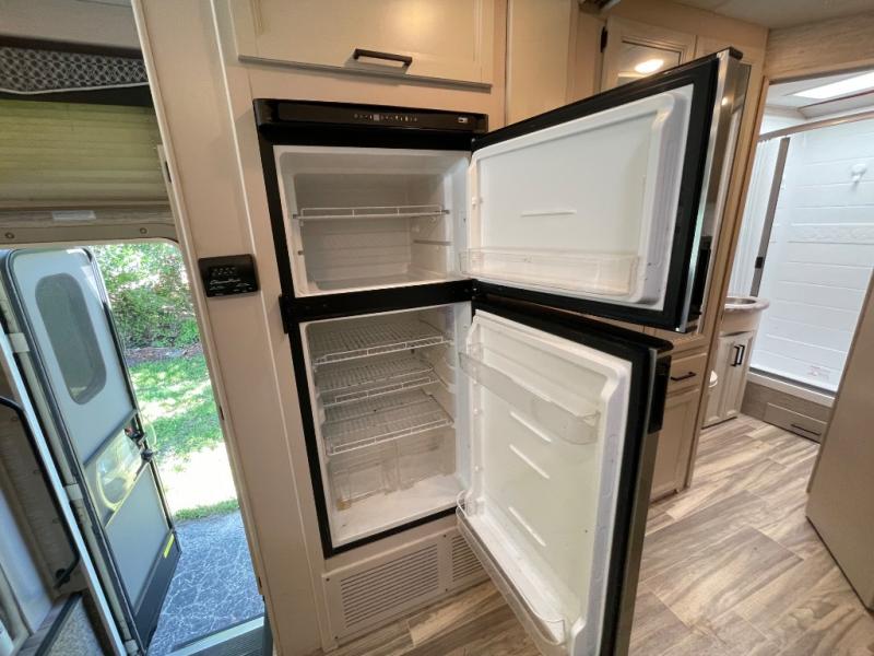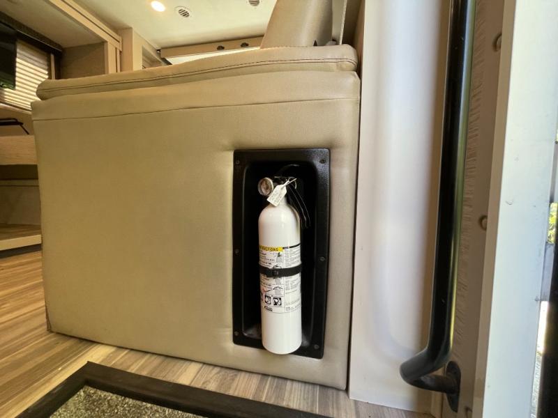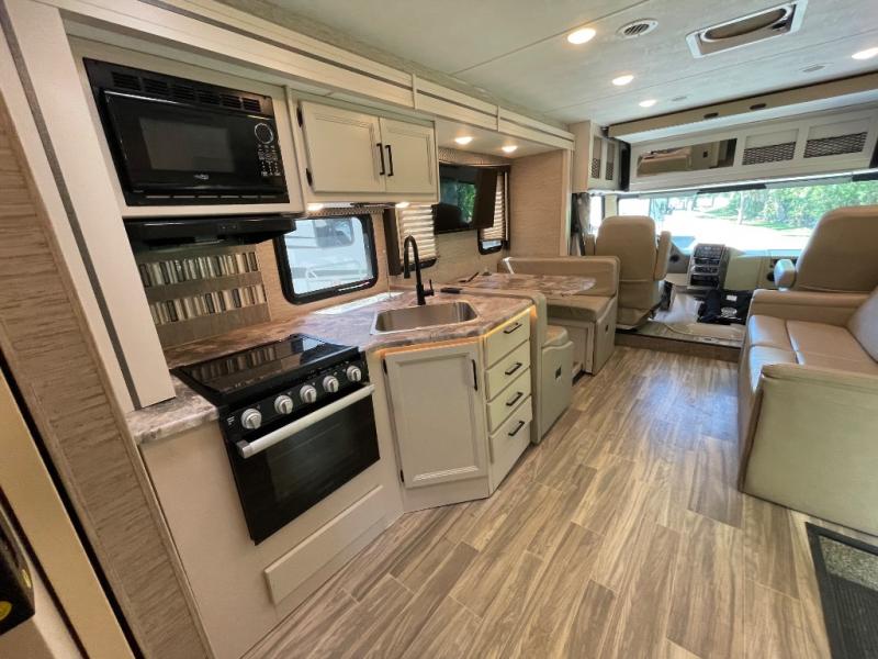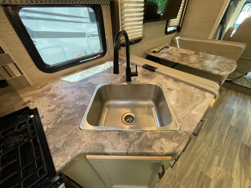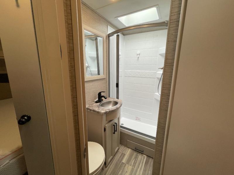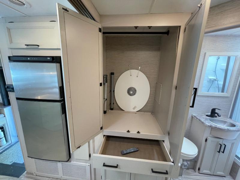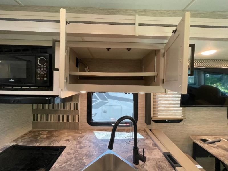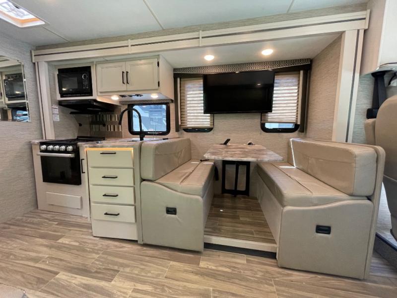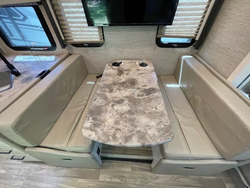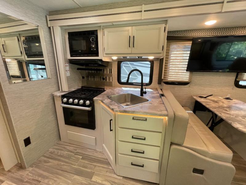 You can't beat the comfort found in this spacious motorhome. Once you park, the kids can take a rest on the drop-down overhead bunk that includes a ladder for easy access. The dream dinette provides a place to enjoy lunch at, and the jack-knife sofa is right across from the 39" TV to check the weather before a hike. After the dishes are cleaned up in the oversized stainless steel single bowl sink, the leftovers can go in the double door refrigerator. This model includes a convenient pantry and a coat/broom closet with hanging hooks to keep your jackets and shoes tidy. You will love the king bed slide out in the private bedroom, along with a 32" TV and quick access to the full bath!