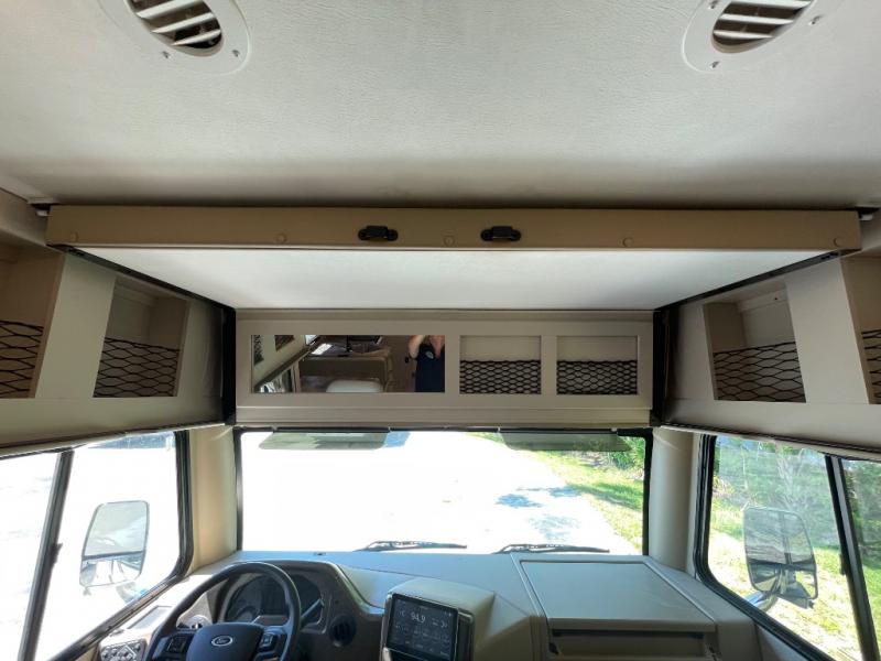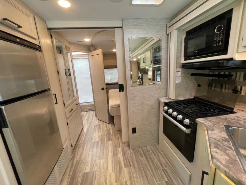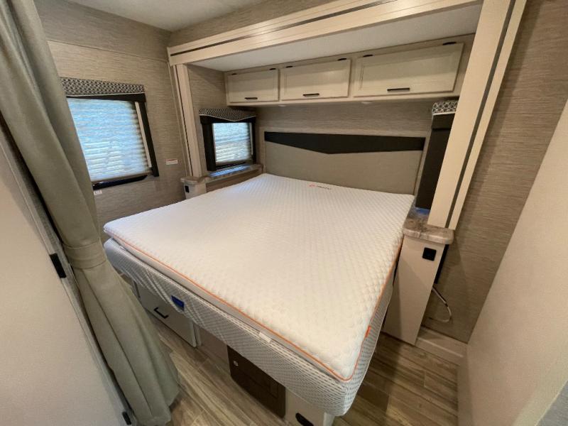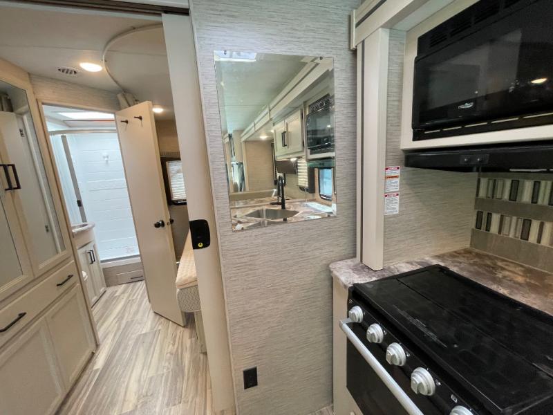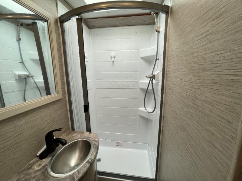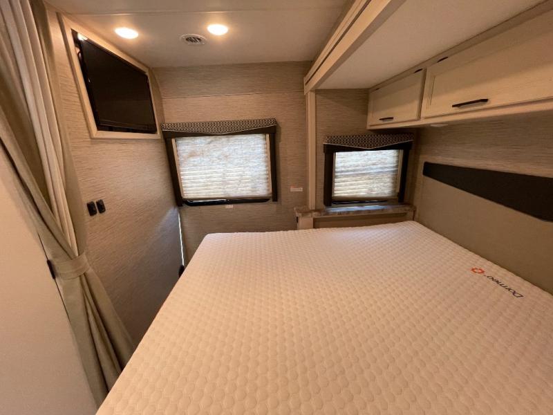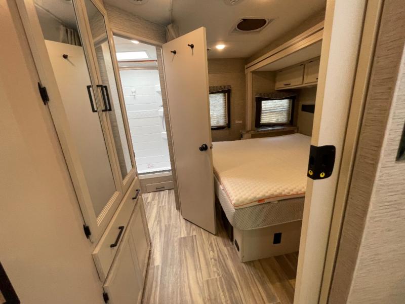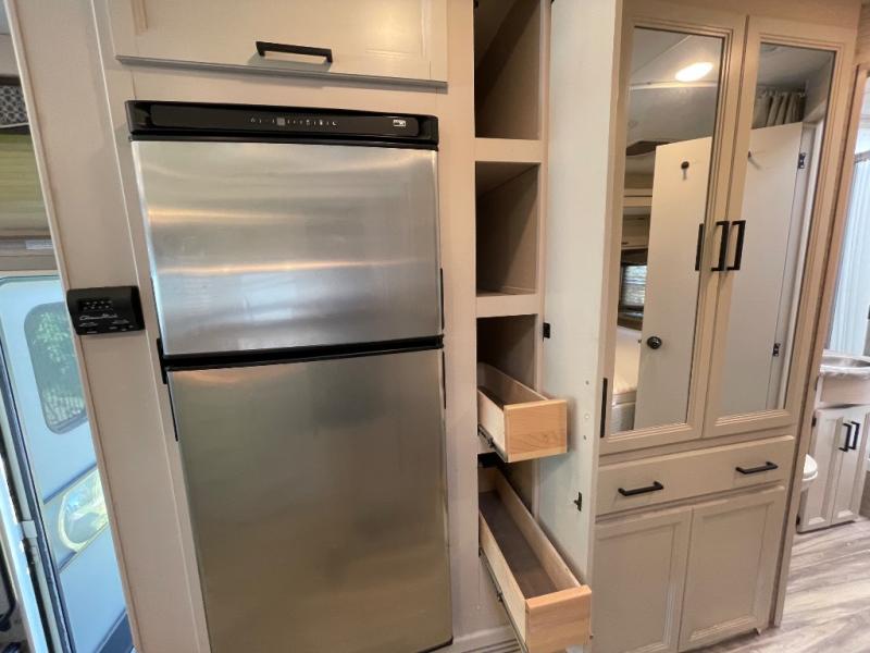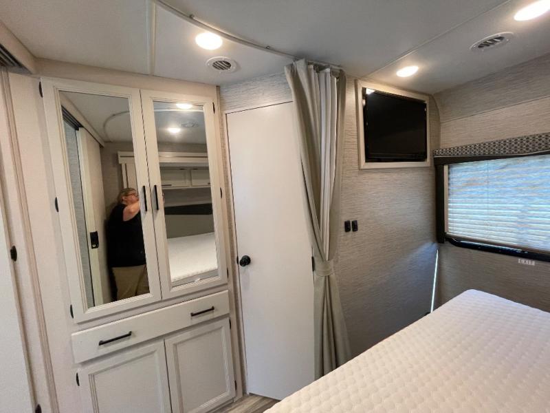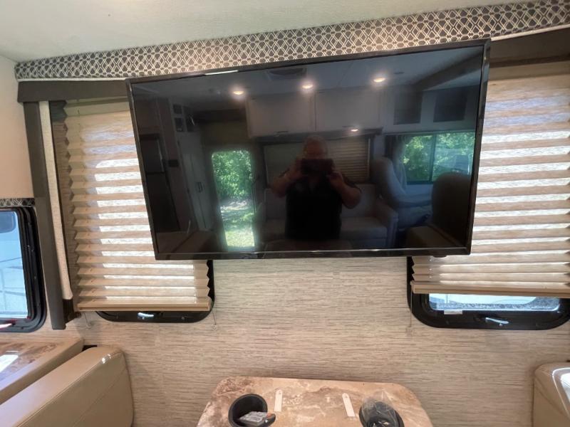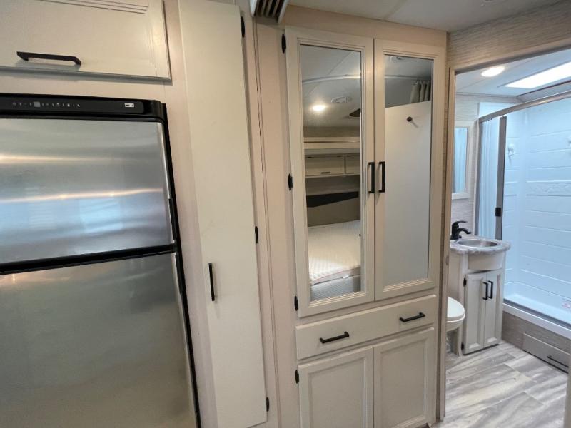 You can't beat the comfort found in this spacious motorhome. Once you park, the kids can take a rest on the drop-down overhead bunk that includes a ladder for easy access. The dream dinette provides a place to enjoy lunch at, and the jack-knife sofa is right across from the 39" TV to check the weather before a hike. After the dishes are cleaned up in the oversized stainless steel single bowl sink, the leftovers can go in the double door refrigerator. This model includes a convenient pantry and a coat/broom closet with hanging hooks to keep your jackets and shoes tidy. You will love the king bed slide out in the private bedroom, along with a 32" TV and quick access to the full bath!