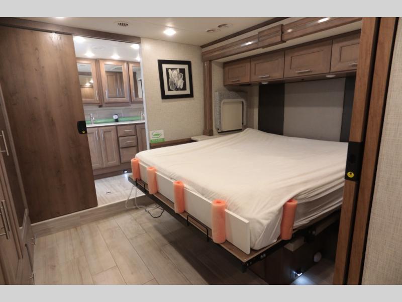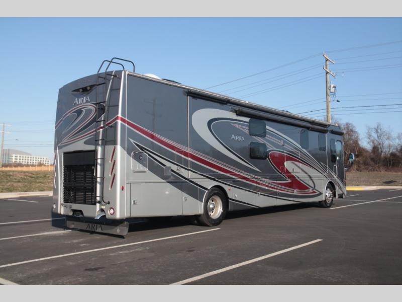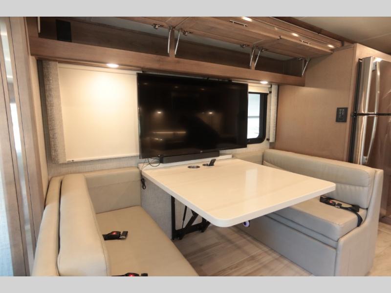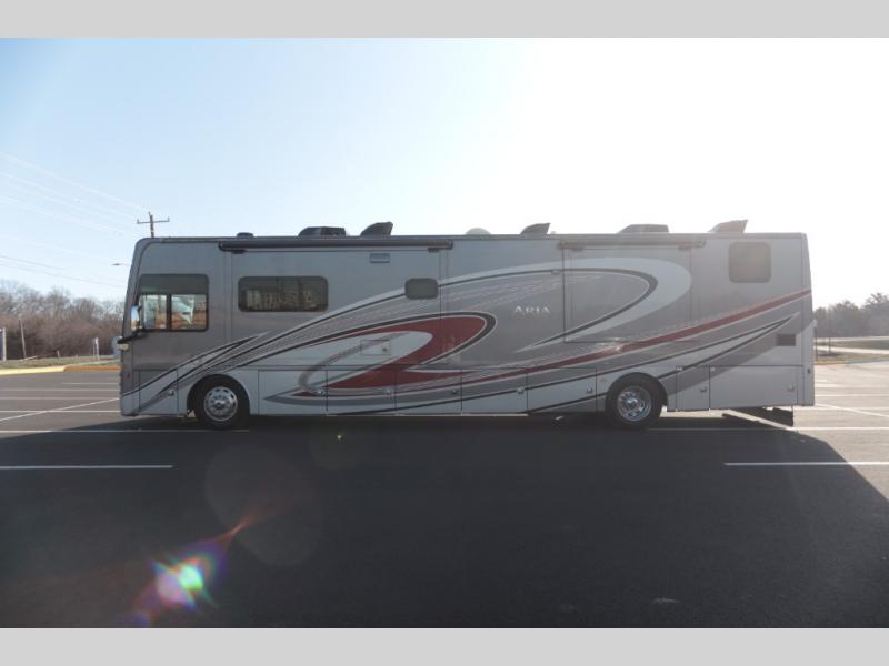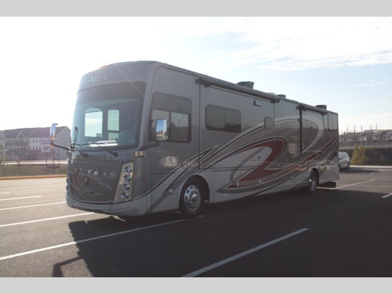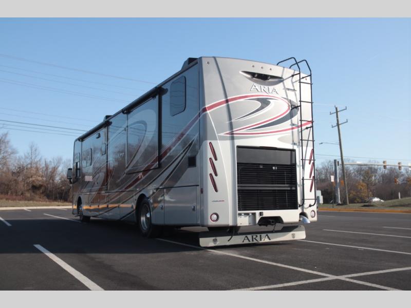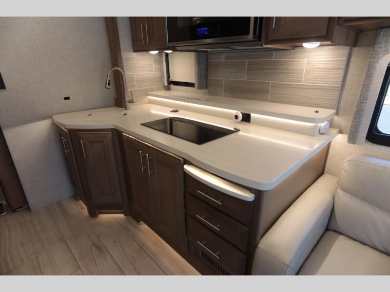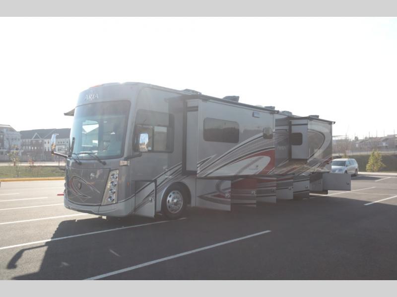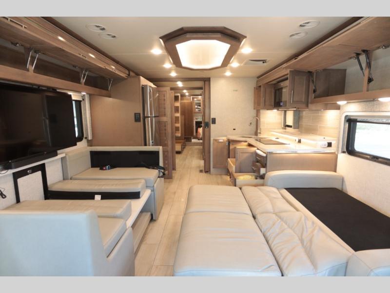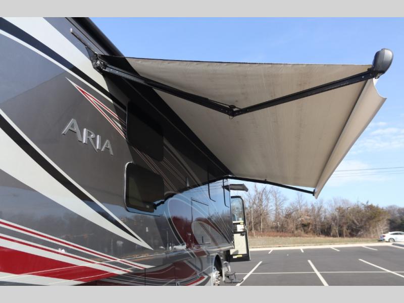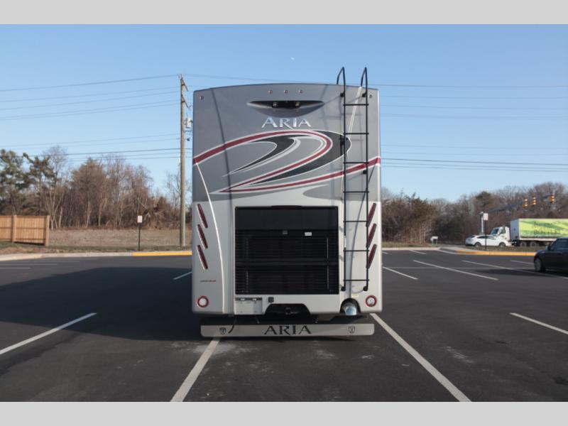 With any Aria Class A diesel motorhome by Thor Motor Coach, experience RV living with all the luxurious amenities you are accustom to, command the roadways with improved handling from the l-beam front axle with a 55-degree wheel cut, and enjoy a smooth ride thanks to the Air-Ride suspension and Sachs shock absorbers. The driver will also appreciate the 10.1" touchscreen dash radio with Bluetooth, navigation, and Sirius/XM prep when navigating the roads, and the comfort of the leatherette reclining/swivel adjustable captain's chairs. The bathroom provides an oversized full height shower with a glass door and a designer backsplash, while the kitchen provides solid surface countertops and a dinette. You will also enjoy designer tile backsplash, a large double bowl stainless steel sink with a single handle faucet, a pull-down sprayer, plus full kitchen amenities. More standout features include the Studio Collection cabinetry with rake style doors and matte finish, living room pin-up lights, and polished porcelain tile flooring, plus much much more depending on the Aria you take on the road!