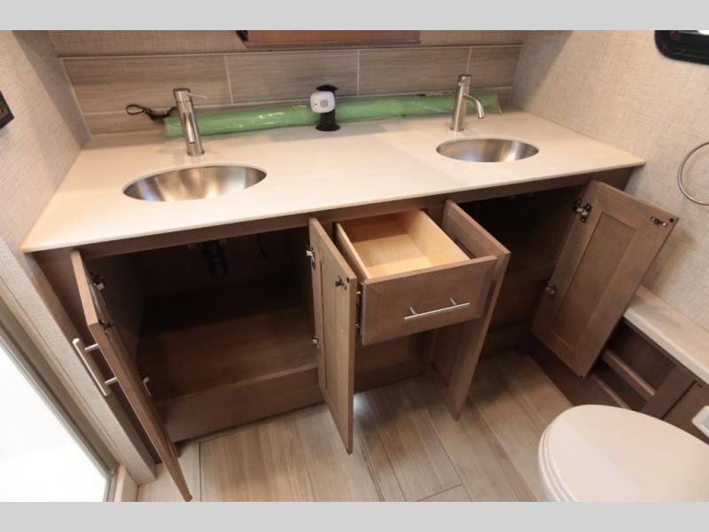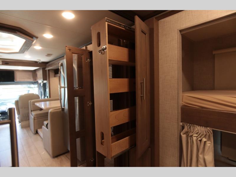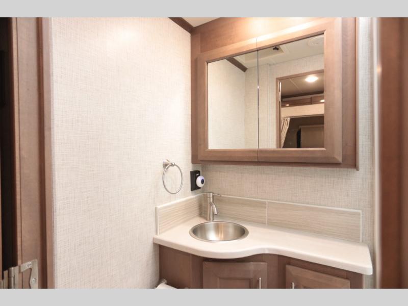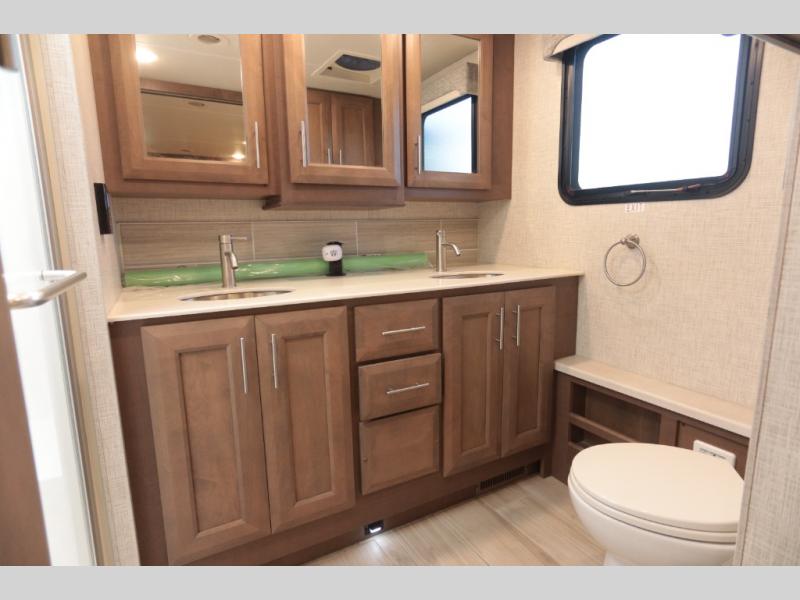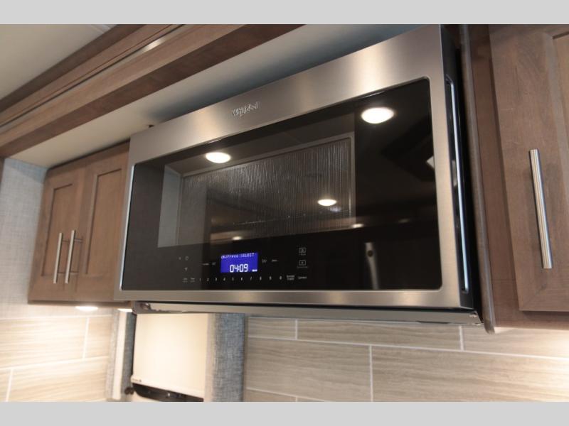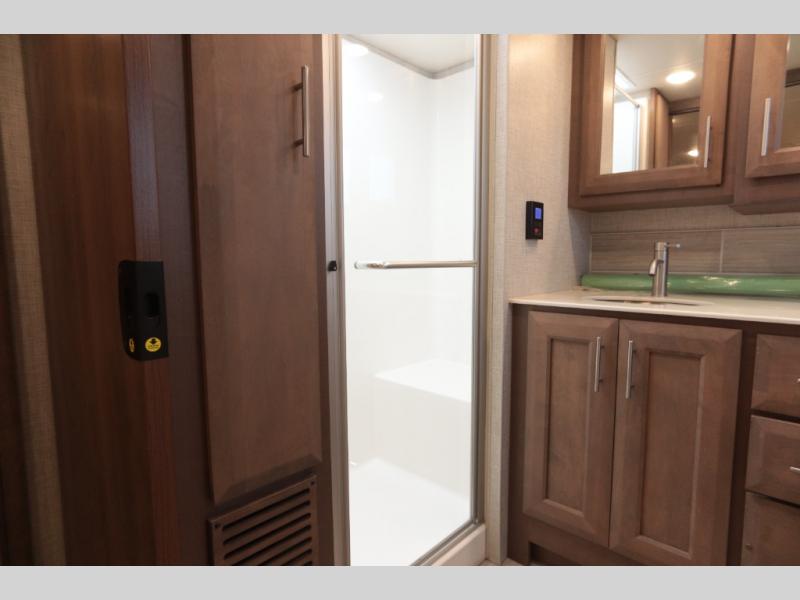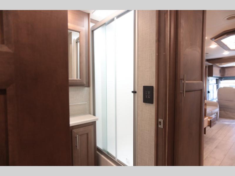 Not many coaches include two full bathrooms, yet this one does for total convenience! The spacious rear bathroom offers a dual-sink vanity and a 52" x 30" full-height shower with glass door that is located off of the walk-through master bedroom with a Tilt-A-View inclining king bed. The other bathroom is mid-coach, and includes a 24" x 34" full-height tub/shower and linen storage directly across from the bunk beds with drawers. In the front, the drop-down overhead bunk above the cab has a 32" TV to watch, and the main living area offers a 49" TV. There is a stackable washer/dryer next to the residential refrigerator allowing you to keep your linens clean and cook at the same time. When it is time to relax, the trifold sofa and Dream dinette, plus captain's chairs that swivel offer seating. And the power awning offers an outdoor living area that is covered for you to sit outside and visit or watch the exterior 39" TV.