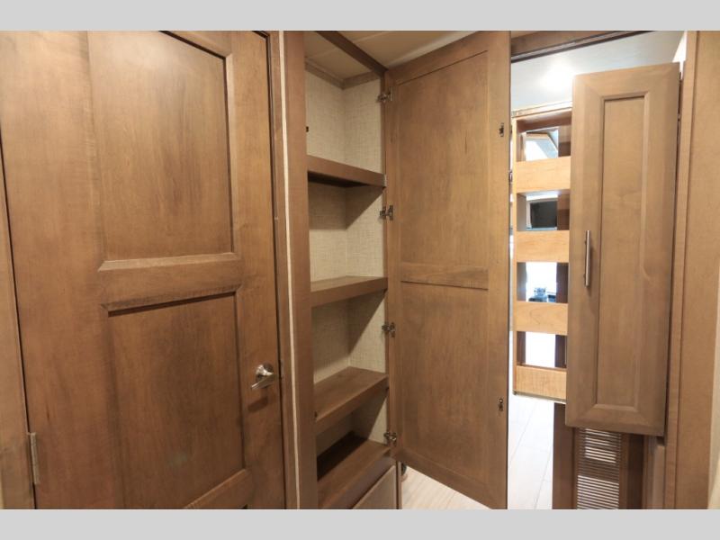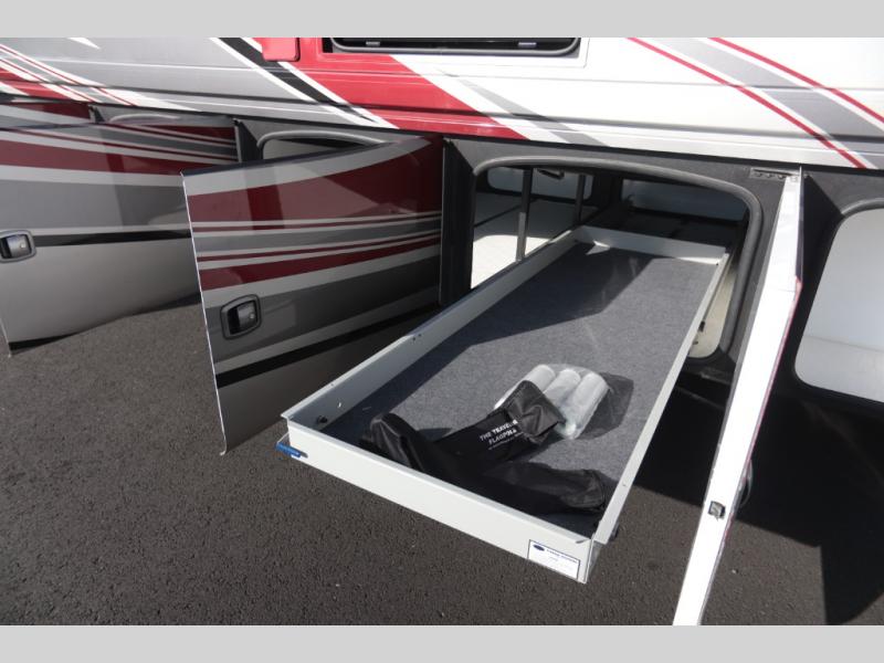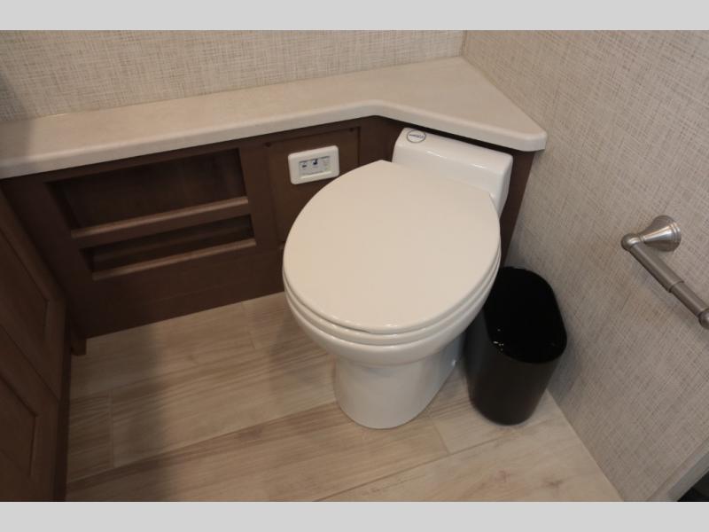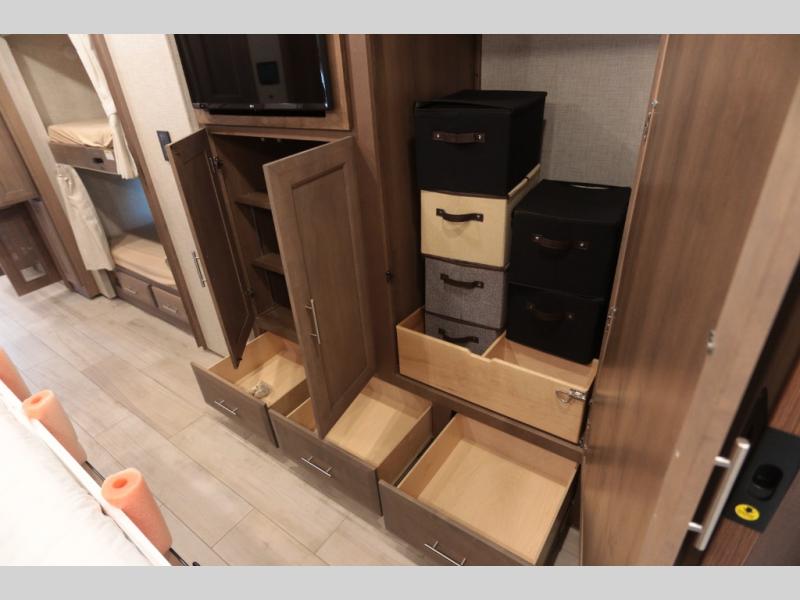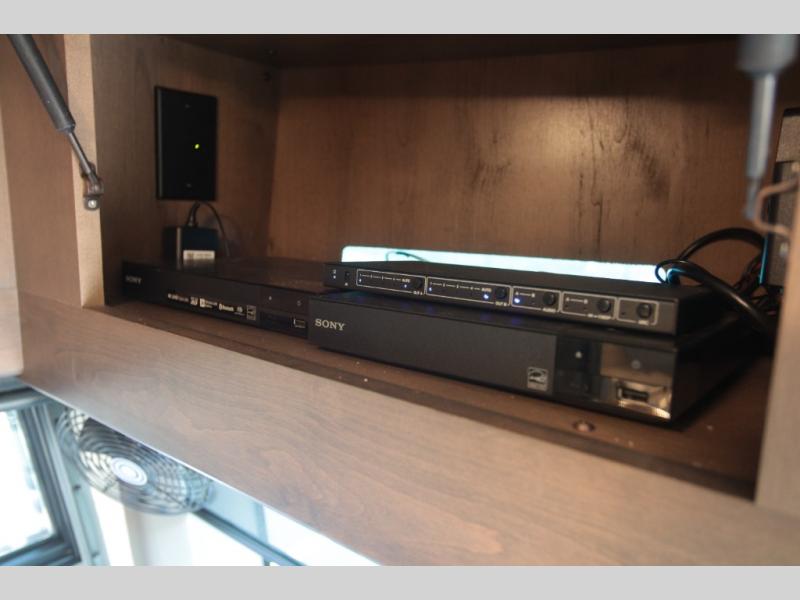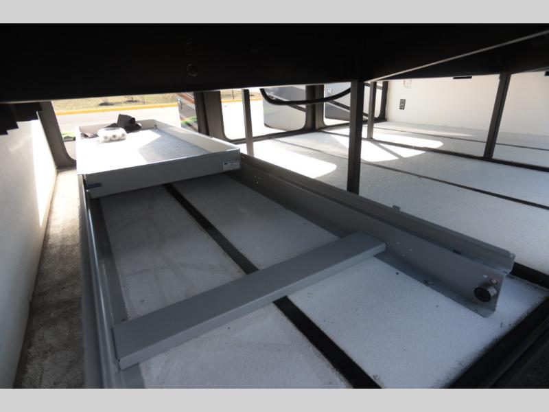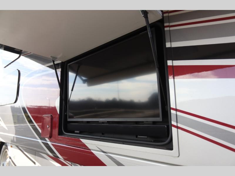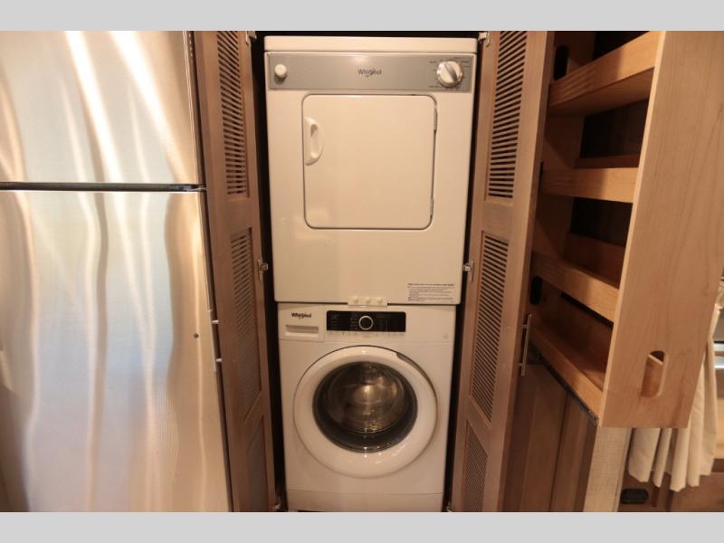 Not many coaches include two full bathrooms, yet this one does for total convenience! The spacious rear bathroom offers a dual-sink vanity and a 52" x 30" full-height shower with glass door that is located off of the walk-through master bedroom with a Tilt-A-View inclining king bed. The other bathroom is mid-coach, and includes a 24" x 34" full-height tub/shower and linen storage directly across from the bunk beds with drawers. In the front, the drop-down overhead bunk above the cab has a 32" TV to watch, and the main living area offers a 49" TV. There is a stackable washer/dryer next to the residential refrigerator allowing you to keep your linens clean and cook at the same time. When it is time to relax, the trifold sofa and Dream dinette, plus captain's chairs that swivel offer seating. And the power awning offers an outdoor living area that is covered for you to sit outside and visit or watch the exterior 39" TV.