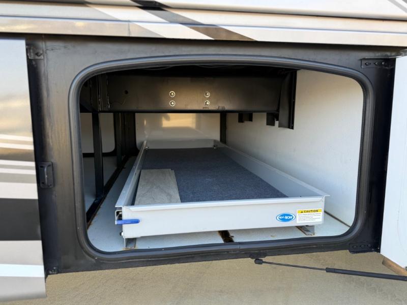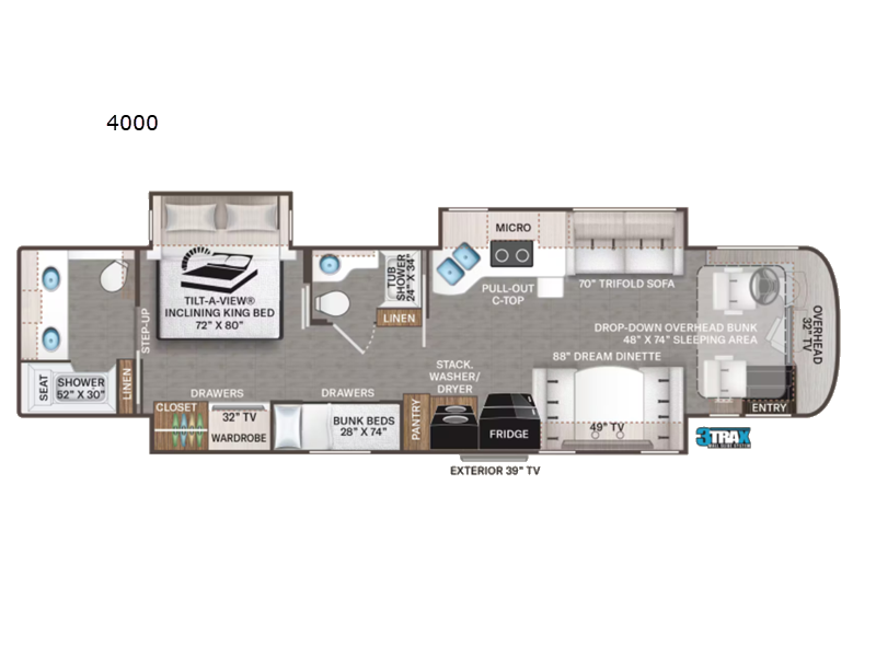 Not many coaches include two full bathrooms, yet this one does for total convenience! The spacious rear bathroom offers a dual-sink vanity and a 52" x 30" full-height shower with glass door that is located off of the walk-through master bedroom with a Tilt-A-View inclining king bed. The other bathroom is mid-coach, and includes a 24" x 34" full-height tub/shower and linen storage directly across from the bunk beds with drawers. In the front, the drop-down overhead bunk above the cab has a 32" TV to watch, and the main living area offers a 49" TV. There is a stackable washer/dryer next to the residential refrigerator allowing you to keep your linens clean and cook at the same time. When it is time to relax, the trifold sofa and Dream dinette, plus captain's chairs that swivel offer seating. And the power awning offers an outdoor living area that is covered for you to sit outside and visit or watch the exterior 39" TV.