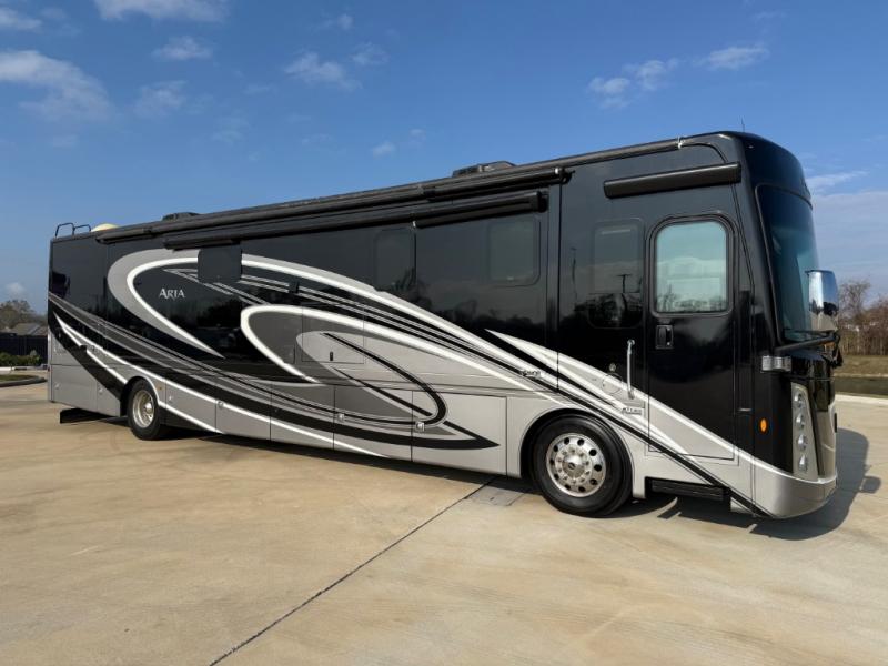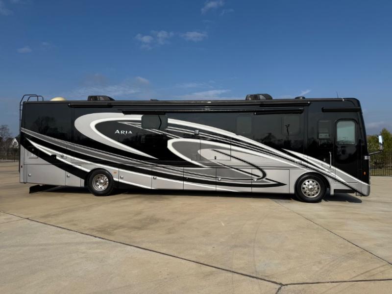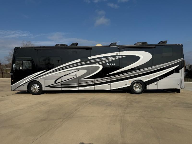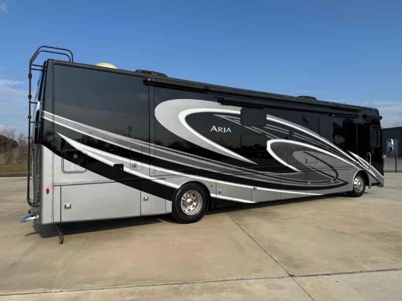 With any Aria Class A diesel motorhome by Thor Motor Coach, experience RV living with all the luxurious amenities you are accustom to, command the roadways with improved handling from the l-beam front axle with a 55-degree wheel cut, and enjoy a smooth ride thanks to the Air-Ride suspension and Sachs shock absorbers. The driver will also appreciate the 10.1" touchscreen dash radio with Bluetooth, navigation, and Sirius/XM prep when navigating the roads, and the comfort of the leatherette reclining/swivel adjustable captain's chairs. The bathroom provides an oversized full height shower with a glass door and a designer backsplash, while the kitchen provides solid surface countertops and a dinette. You will also enjoy designer tile backsplash, a large double bowl stainless steel sink with a single handle faucet, a pull-down sprayer, plus full kitchen amenities. More standout features include the Studio Collection cabinetry with rake style doors and matte finish, living room pin-up lights, and polished porcelain tile flooring, plus much much more depending on the Aria you take on the road!