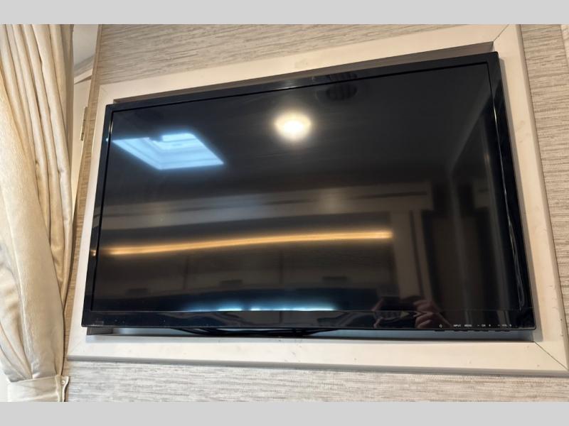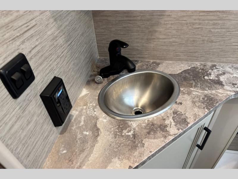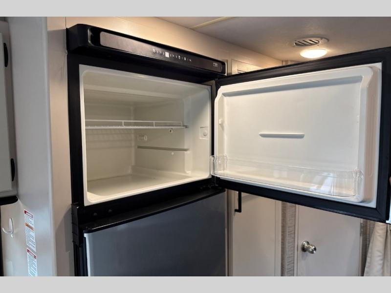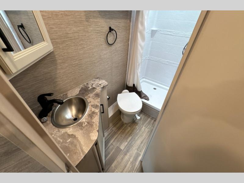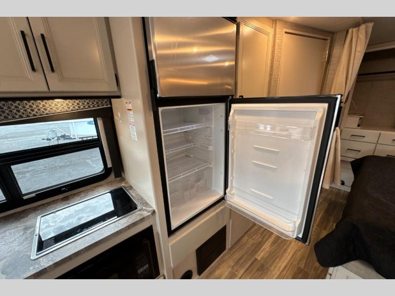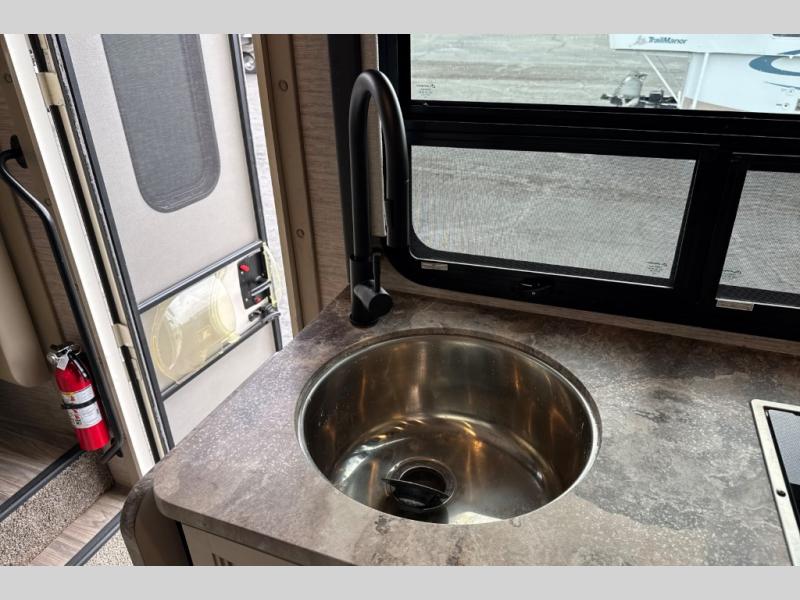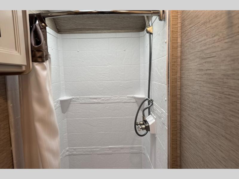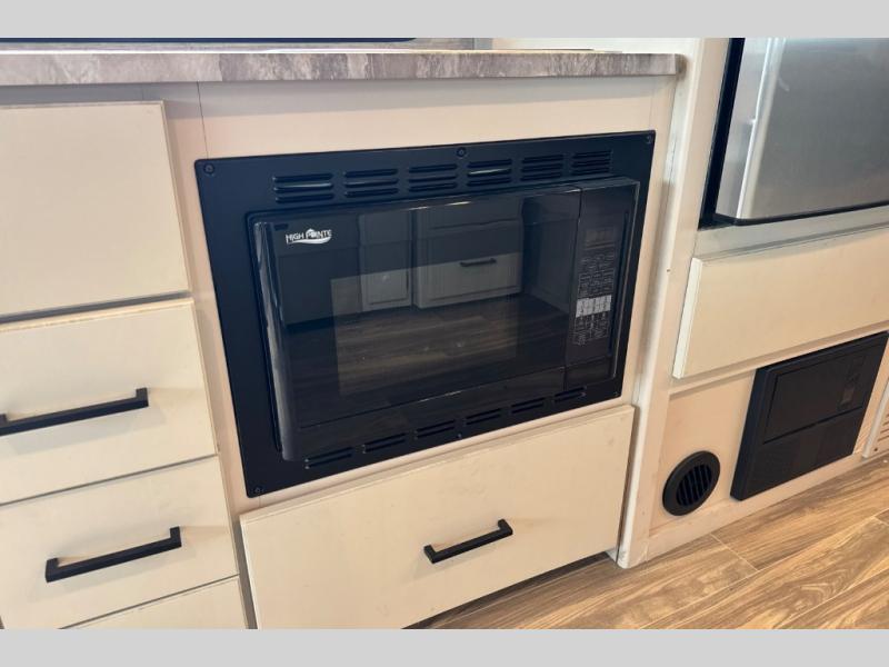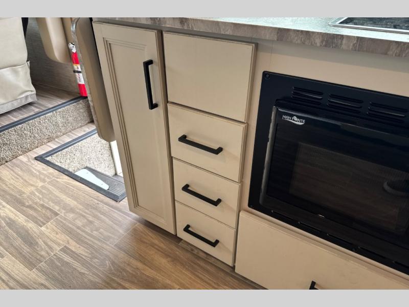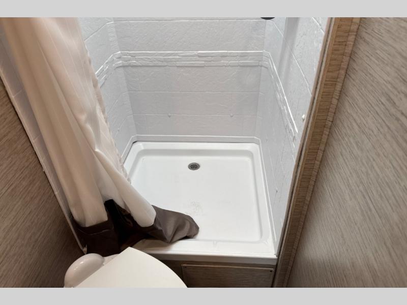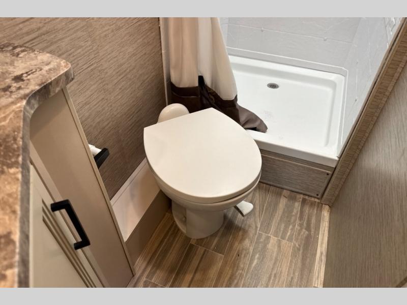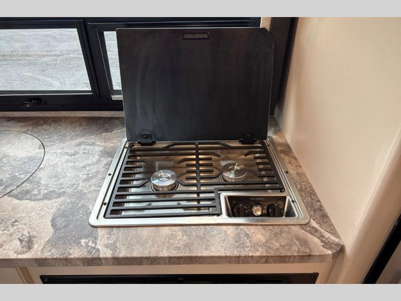 Wherever you decide to roam, do it comfortably in this RUV coach. There is a flip-up queen bed with cushioned seating underneath so you can enjoy added seating space during the day, plus there is a 32" bedroom TV to watch the morning news on. Having a full bath on board is super convenient, especially with a foot flush porcelain toilet, a deluxe shower, and a power vent to keep everything fresh. Once the chef of your group has made lunch on the two burner gas cooktop or in the convection microwave, you can dine at the Dream Dinette or sit outdoors under the 18' power awning with LED lights. This model also includes tons of storage space, including three wardrobes!