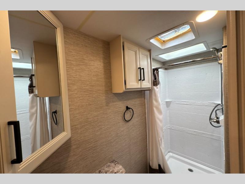 With any Axis RUV Class A gas motorhome by Thor Motor Coach you will enjoy added technology features to make each trip enjoyable, like the RapidCamp+ multiplex lighting and systems control and the Winegard ConnecT 2.0 Wi-Fi/4G/TV antenna. Each model features heated and remote exterior mirrors with integrated side view cameras, reclining and swivel leatherette captain's chairs, and a dash workstation with 110-volt and 12-volt outlets to get some work done if needed. Relaxing after a long day of traveling will be easy with the leatherette furniture, the Euro-style cabinet doors, and 82" interior ceiling height. The HD-MAX exterior with graphics package and black frameless windows provide a sleek look you are sure to love, and don't overlook the power awning with integrated LED lighting and lighted rotocast storage compartments for all your gear.