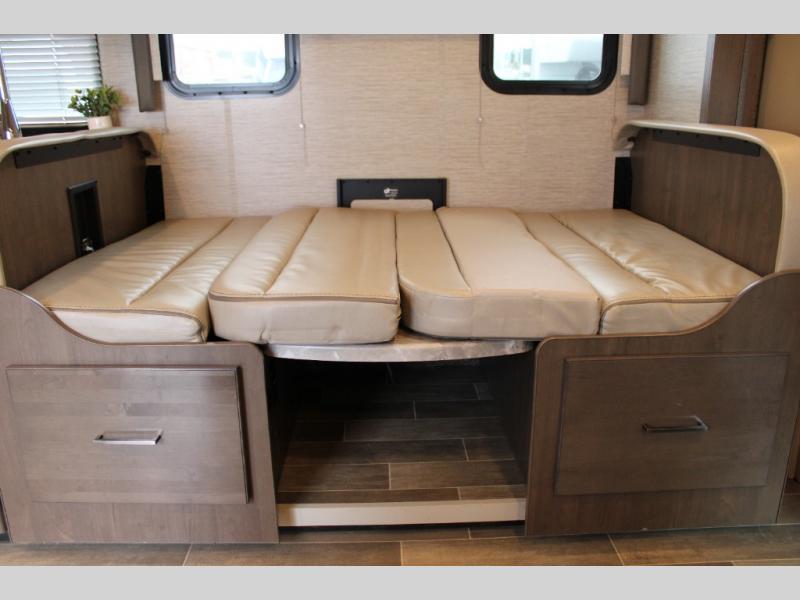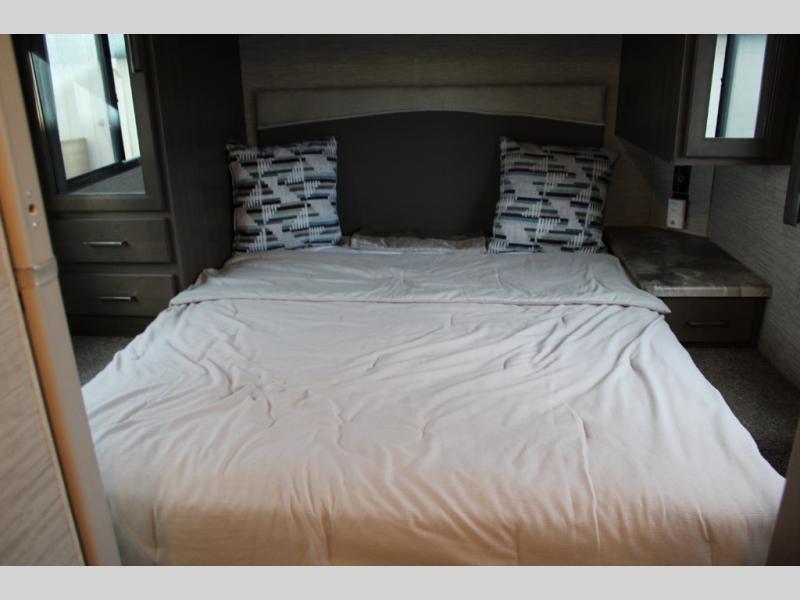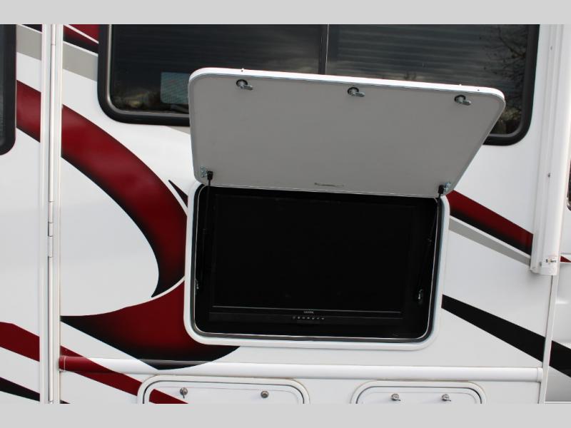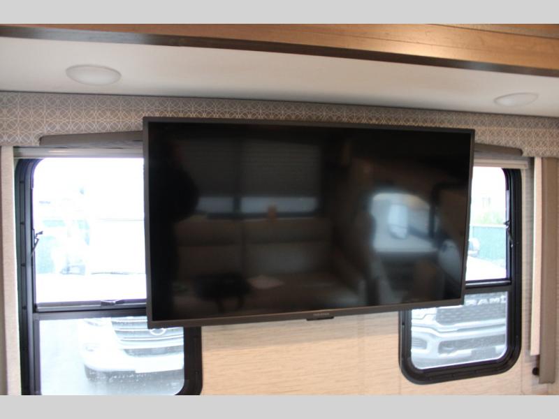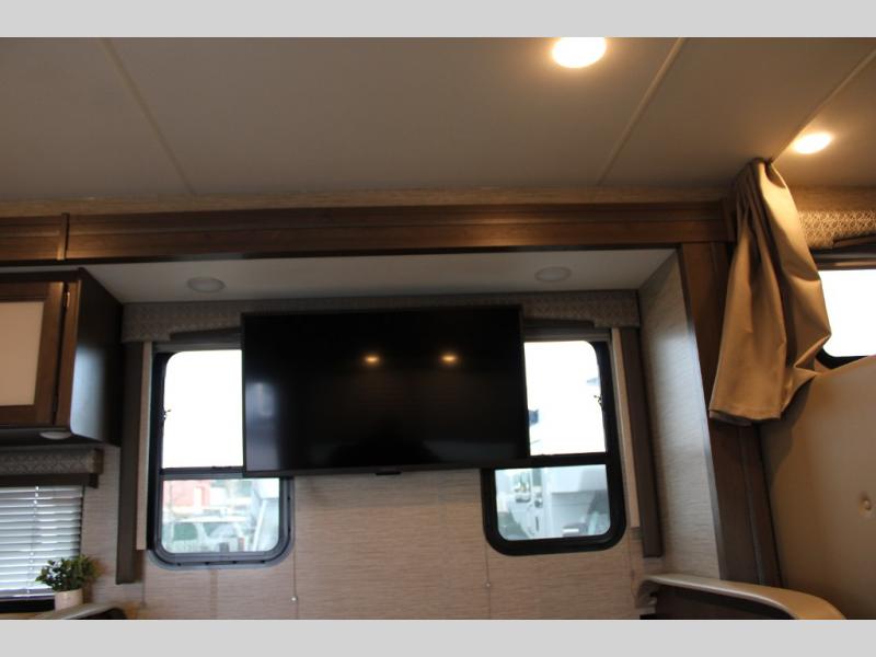 This motorhome will have you feeling right at home where ever you go! It features a 54" x 96" bunk over cab for sleeping or storage space and a rear private bedroom with a 60" x 74" queen bed that has closets on either side and an optional 32" TV across from it. The full bathroom has a 24" x 36" shower to freshen up in each morning. Prepare your best home cooked meals with the three burner cooktop, double door refrigerator, and microwave oven then enjoy them at the 71" dream dinette. The 68" jackknife sofa is a comfortable place to relax at night while watching a movie with the 39" TV or you can switch it out for the optional theater seating instead. You can even enjoy outside entertainment with the optional exterior 32" TV!