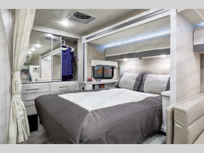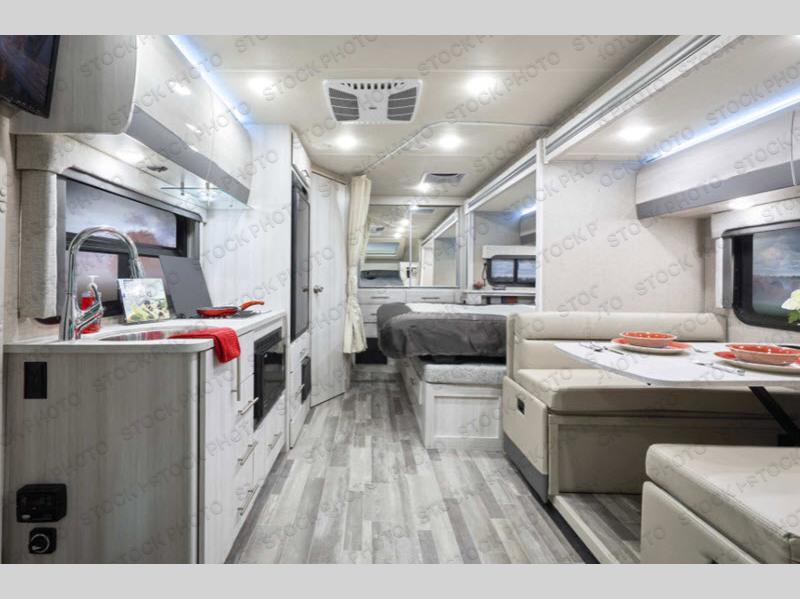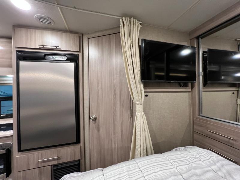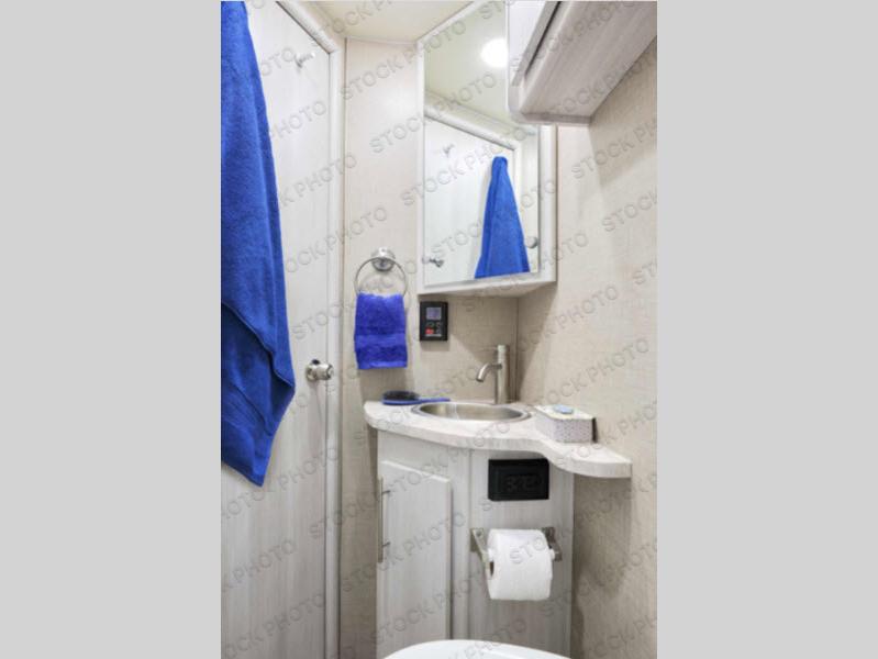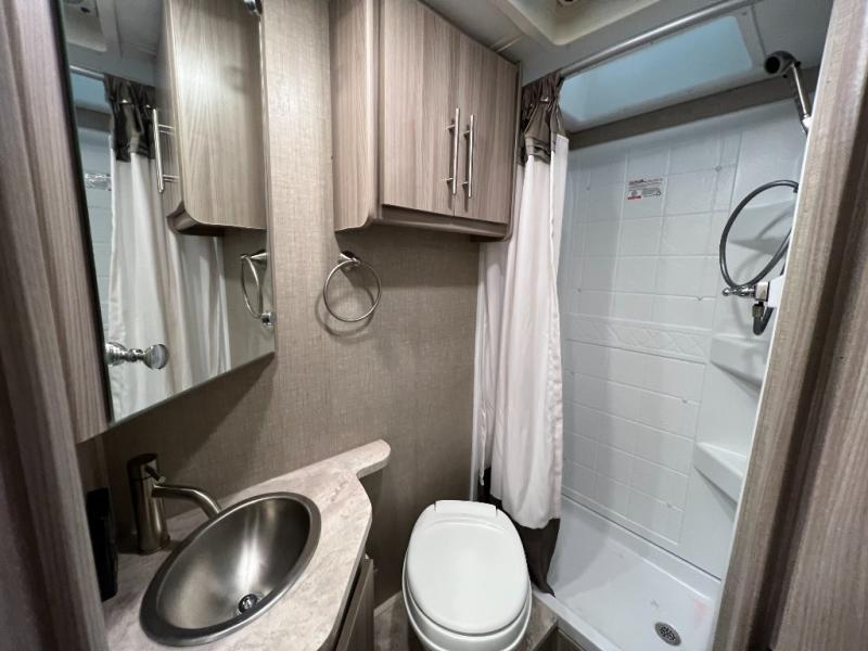 You can tour a local winery or trek up north to find a cozy and secluded camping spot with this Compass AWD Class B+ gas motorhome! All of your needs will be met with the excellent features and amenities included on this coach, like the full bathroom complete with a 24" x 32" shower, three robe hooks, a shower skylight, a foot-flush toilet, and a power bath vent. The kitchen is ready to help you make mobile meals, and the 68" Dream Dinette is the perfect place for eating those meals or playing a game later on. At the dinette table top, you'll find a wireless phone charger with USB plug so that you can charge your phones. There is a privacy curtain that sections off the flip-up RV queen bed, and you'll also find a 32" TV in the bedroom. The second 32" TV is located out in the main living area for everyone else to watch.