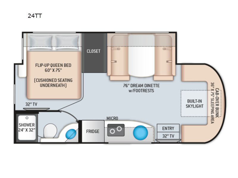 One look at this full-wall slide out coach and you'll be hooked! The swivel captain's seats can become a part of the living area once you're parked, and your guests can sit at the 76" Dream Dinette with footrests. Prepare lunch on the two burner gas cooktop, or use the convenient convection microwave. You'll find a large closet that can be used for clothes, food, or miscellaneous camp gear, plus there are overhead compartments for even more storage. The cab-over bunk provides additional sleeping space, and you'll enjoy the flip-up queen bed in the bedroom, along with a 32" TV.